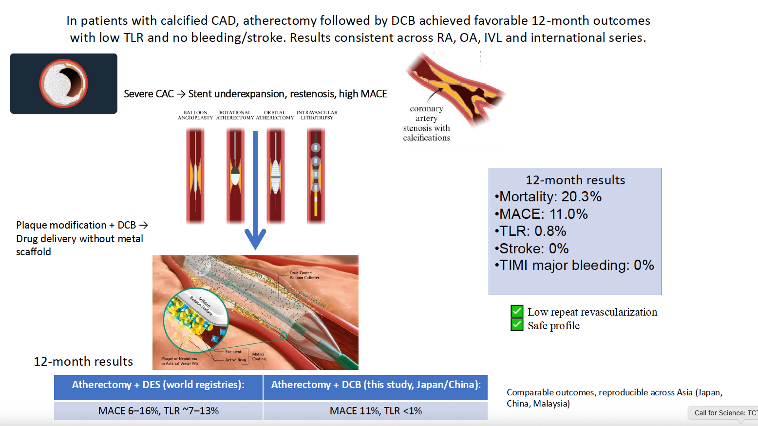 In a real-world Asian cohort with severe coronary calcification, atherectomy-facilitated DCB PCI yielded low ischemic complications, very low repeat revascularization (TLR 0.8%), and acceptable survival despite high comorbidity burden. Importantly, outcomes were consistent across IVL, OAS, and RA, supporting the principle that adequate lesion preparation—rather than device choice—drives success when pursuing a stent-sparing strategy.