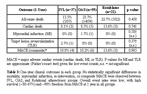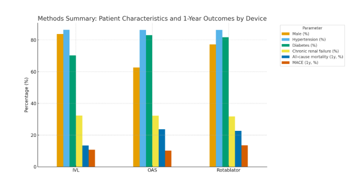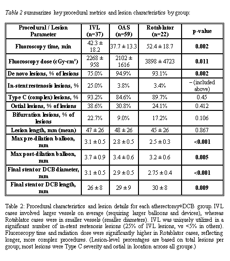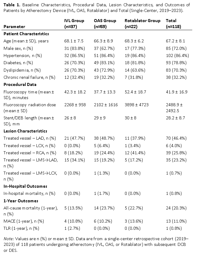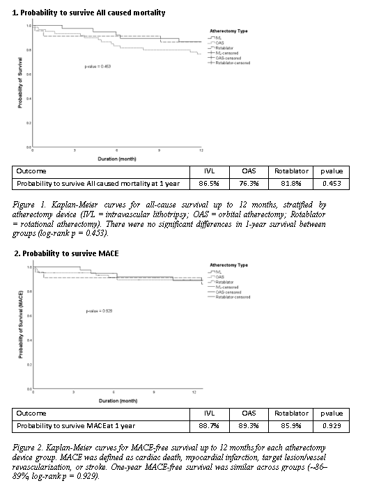 A total of 118 patients were included: IVL (n=37), OAS (n=59), and Rotablator (n=22). Mean age was 67 ¡¾ 8 years, and 72% were male. Cardiovascular risk factors were common: hypertension (86%), diabetes (79%), dyslipidemia (70%), and chronic renal failure (32%).Lesion distribution involved LAD in 46%, RCA in 26%, and LMS–LAD in 23%. Most lesions were de novo (89%) and type C (88%), with bifurcation in 15% and CTO in 4%. Mean lesion length was 47 ¡¾ 26 mm.Procedural success was achieved in 98%. Fluoroscopy time was shortest with OAS (37.7 ¡¾ 13.3 min) and longest with Rotablator (52.4 ¡¾ 18.7 min, p = 0.002). Radiation dose was significantly higher with Rotablator (3898 ¡¾ 4723 vs. 2102 ¡¾ 1616 with OAS and 2268 ¡¾ 958 with IVL, p = 0.011).In-hospital mortality was 0.8% (1 patient, OAS group). At 1 year, all-cause mortality was 20.3% (13.5% IVL, 23.7% OAS, 22.7% Rotablator; p = 0.458). MACE occurred in 11.0% overall, with no significant difference between groups (10.8% IVL, 10.2% OAS, 13.6% Rotablator; p = 0.905). TLR was rare (0.8%, one patient in IVL group). Kaplan–Meier analysis showed similar survival for both all-cause mortality (86.5% IVL vs. 76.3% OAS vs. 81.8% Rotablator; p = 0.453) and MACE-free survival (88.7% IVL vs. 89.3% OAS vs. 85.9% Rotablator; p = 0.929).Overall, outcomes of atherectomy + DCB strategy were consistent across devices, with comparable 1-year mortality and MACE rates to international reports.