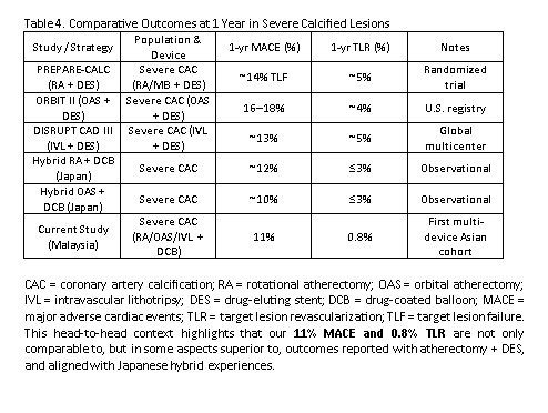 Severe coronary artery calcification (CAC) remains one of the most challenging substrates for PCI, leading to impaired device delivery, suboptimal stent expansion, and worse clinical outcomes. In contemporary practice, atherectomy plus stenting with new-generation drug-eluting stents (DES) is the dominant strategy. Yet even with plaque modification, outcomes remain inferior to those in non-calcified lesions. In the PREPARE-CALC trial, RA or modified balloons followed by DES implantation achieved procedural success rates >95%, but 1-year target lesion failure (TLF) remained 13.8%, largely driven by repeat revascularization1. Similarly, the ORBIT II registry of OAS + DES in severe CAC reported 1-year MACE ~16–18% and TLR ~4%, underscoring that calcium remains a predictor of events despite stenting2. Real-world U.S. registries (NCDR CathPCI) consistently show higher restenosis and mortality after DES in CAC, with MACE exceeding 15% at 1 year and TVR rates 5–10%, substantially higher than in non-calcified disease3. Even with IVL, hailed as a newer calcium-cracking technology, registries such as DISRUPT CAD III report 1-year MACE ~13% with DES implantation. These data emphasize that while stenting after atherectomy or IVL provides acceptable safety, calcified lesions carry higher risks of restenosis, revascularization, and adverse events compared with non-calcified disease4. Against this background, atherectomy followed by drug-coated balloon (DCB) angioplasty has emerged as an alternative strategy aiming to maximize acute lumen gain while avoiding permanent metallic scaffolds. Early Japanese and Chinese experiences suggest feasibility, with MACE rates around 10–12% at 1 year and TLR rates ¡Â3%, comparable to DES despite the absence of a stent. However, robust data remain sparse, especially in Asian populations outside Japan and China55-8. Accordingly, we sought to evaluate the outcomes of atherectomy + DCB in a real-world Asian cohort, directly comparing IVL, OAS, and RA. We hypothesized that 12-month MACE and TLF/TLR would be similar across modalities and at least comparable to outcomes reported for atherectomy + DES worldwide.