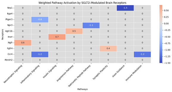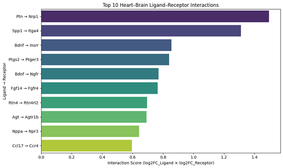 Using publicly available transcriptomicdatasets from empagliflozin-treated murine cardiac (GSE270093) and rat braintissue (GSE206986), we performed differential gene expression and pathwayenrichment analyses. Ligand–receptor interactions between heart-derived ligandsand brain-expressed receptors were mapped and simulated under knockout andoverexpression conditions. Receptor-weighted pathway propagation models andbrain single-cell transcriptomic data (DropViz) were integrated to inferdownstream signaling effects. A network model was constructed to visualize coreinter-organ signaling routes.