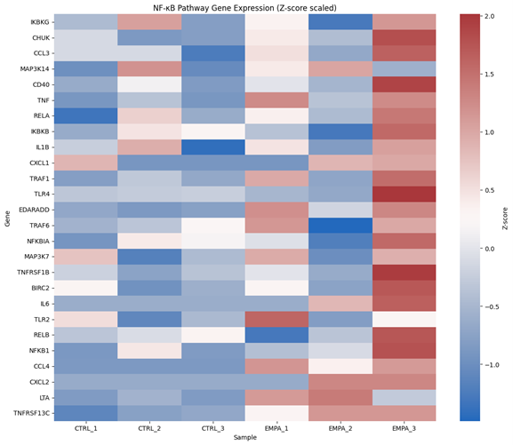 Empagliflozin downregulated cardiac stressgenes (e.g., Nppa, Nppb), fibrotic markers (Col1a1, Timp1), and inflammatorycytokines (Il1b, Cxcl10), while upregulating sympathetic and mitochondrialgenes. Brain transcriptomes revealed upregulation of NF-¥êB and toll-likereceptor pathways. Cross-tissue analysis identified key ligand–receptor axes(e.g., CXCL2¡æCXCR2, BDNF¡æINSRR) that linked cardiac output to brain receptoractivation. Simulated perturbations revealed fragile vs. amplifiable signalingroutes. DropViz analysis confirmed cell-type–specific receptor localization inneurons and glia. A final network diagram highlighted integrated cytokine,neurotrophic, and metabolic communication across the heart–brain axis.