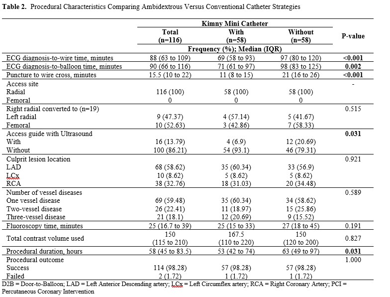 Baseline demographic, clinical, and angiographic characteristics were well balanced between groups, with no significant differences in age, sex, cardiovascular risk factors, or culprit lesion distribution, ensuring that observed outcomes reflected catheter strategy rather than baseline imbalances.The ambidextrous approach significantly reduced key procedural time intervals. Puncture-to-wire cross was shorter compared with the conventional diagnostic-to-guide strategy (11 vs 21 minutes, p < 0.001). Diagnosis-to-wire and diagnosis-to-balloon times were also reduced by approximately 28 and 27 minutes, respectively. Total procedural duration was shorter in the ambidextrous group (53 vs 63 minutes, p = 0.03). Fluoroscopy time and contrast volume were similar, confirming that the observed efficiency gains were related to workflow rather than case complexity. The consistent reduction in reperfusion-related intervals underscores the potential for this strategy to facilitate faster reperfusion in routine practice.Procedural success exceeded 95% in both groups. Complications were less frequent with the ambidextrous catheter (8.6% vs 24.1%, p = 0.02), driven mainly by fewer vascular access and catheter-related events. Coronary complications such as dissection and no-reflow were rare and showed no significant differences, suggesting that procedural streamlining did not increase coronary risk.In-hospital mortality was low overall. Although numerically higher in the ambidextrous group (6.9% vs 1.7%), this difference was not statistically significant (p = 0.17). Reinfarction and stroke were rare events and occurred at similar rates between the two groups.