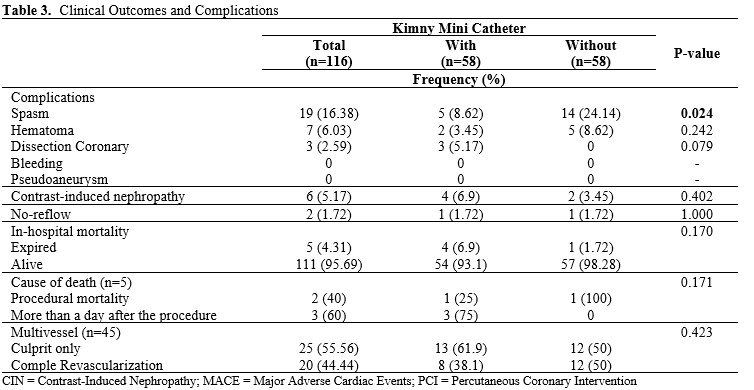 Safety outcomes comprised vascular access complications, coronary complications such as dissection, perforation, or no-reflow, and in-hospital adverse events including reinfarction, stroke, or death. Data were independently reviewed and validated to ensure accuracy.