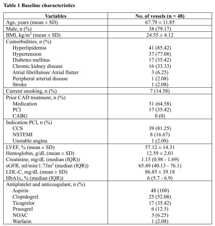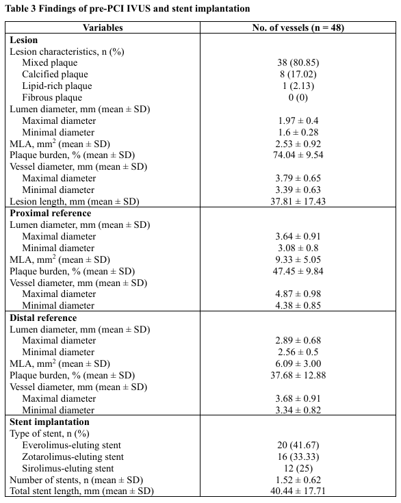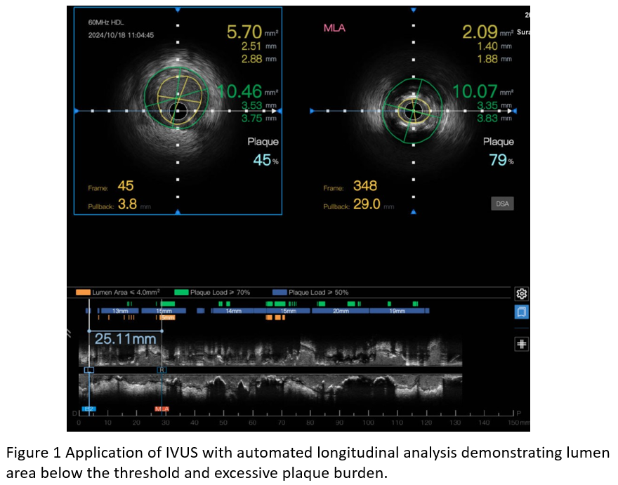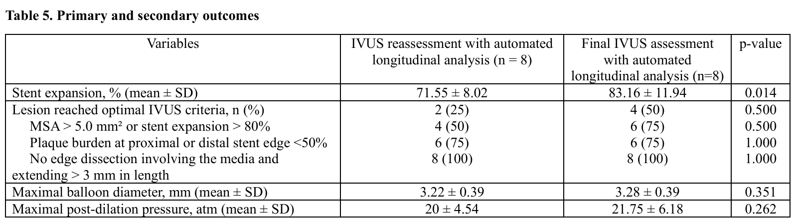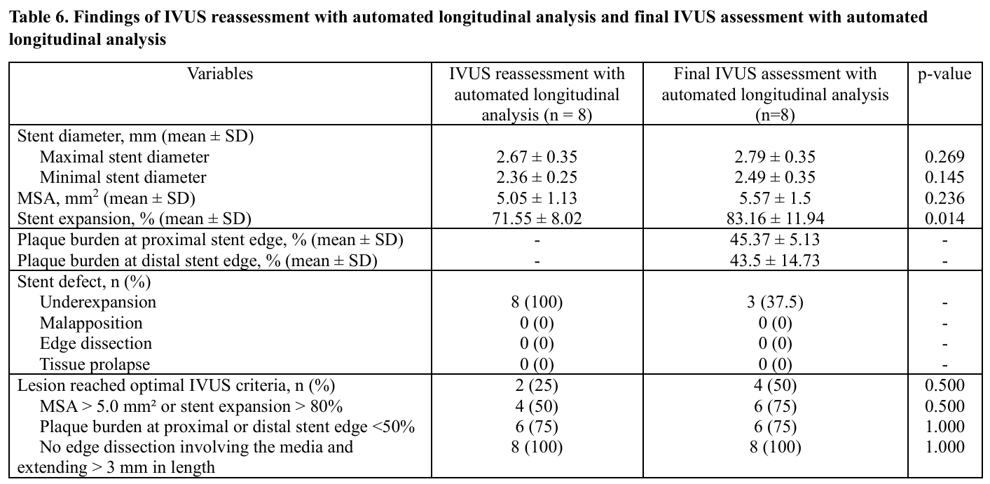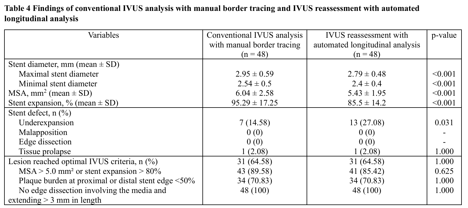 A total of 48 vessels were evaluated. The mean age was 67.8 ¡¾ 11.9 years and 79.2% were male. Mean BMI was 24.6 ¡¾ 4.1 kg/m©÷. Comorbidities included hyperlipidemia (85.4%), hypertension (77.1%), diabetes mellitus (35.4%) and chronic kidney disease. (33.3%) 14.6% were current smokers. A prior PCI history was present in 35.4%. Most patients underwent PCI for chronic coronary syndrome (81.3%) followed by NSTEMI (16.7%) and unstable angina (2.1%). The mean LVEF was 57.1 ¡¾ 14.3%.Angiographically, triple-vessel disease occurred in 66.7%, while single- and double-vessel disease were seen in 14.6% and 18.8%, respectively. The radial approach was used in 68.8%. Target vessels included the LAD (47.9%), RCA (27.1%), LM (14.6%) and LCx (10.4%). Bifurcation lesions were found in 47.9% and moderate-to-severe calcification in 56.3%. According to AHA/ACC classification, type B lesions predominated (68.8%) followed by type C (22.9%) and type A (8.3%). Mean pre-PCI stenosis was 83.5 ¡¾ 9.3%.Pre-PCI IVUS revealed mixed plaque (80.9%) and calcified plaque (17.0%). Mean minimal lumen area (MLA) was 2.53 ¡¾ 0.92 mm©÷ with lesion length 37.8 ¡¾ 17.4 mm. Proximal reference lumen area averaged 9.33 ¡¾ 5.05 mm©÷ (plaque burden 47.5 ¡¾ 9.8%) and distal reference lumen area 6.09 ¡¾ 3.00 mm©÷ (plaque burden 37.7 ¡¾ 12.9%). The mean stent number per lesion was 1.52 ¡¾ 0.62 with total stent length 40.4 ¡¾ 17.7 mm.Compared with conventional IVUS analysis, automated longitudinal analysis yielded smaller measurements of maximal stent diameter (2.79 ¡¾ 0.48 mm vs 2.95 ¡¾ 0.59 mm, p < 0.001), minimal stent diameter (2.40 ¡¾ 0.40 mm vs 2.54 ¡¾ 0.50 mm, p < 0.001), MSA (5.43 ¡¾ 1.95 mm©÷ vs 6.04 ¡¾ 2.58 mm©÷, p < 0.001) and stent expansion (85.5 ¡¾ 14.2% vs 95.3 ¡¾ 17.3%, p < 0.001). Underexpansion was more frequently detected by automated analysis (27.1% vs 14.6%, p = 0.031).Among eight vessels requiring additional post-dilation, mean stent expansion improved significantly from 71.6 ¡¾ 8.0% to 83.2 ¡¾ 11.9% (p = 0.014). Lesions meeting all optimal IVUS criteria increased from 25% to 50%, without statistical significance. Balloon diameter and inflation pressure showed non-significant increases.