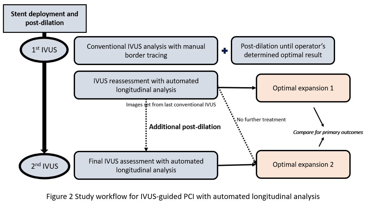 Coronary artery disease (CAD) is one of the leading causes of morbidity and mortality worldwide. Percutaneous coronary intervention (PCI) with stent implantation is a cornerstone in the treatment of CAD. However, post-procedural complications such as in-stent restenosis (ISR) and stent thrombosis continue to pose major clinical challenges. One of the key contributing factors to these complications is suboptimal stent deployment. Intravascular ultrasound (IVUS) has been developed as an imaging modality to enhance the efficacy of PCI. Evidence from previous trials such as the IVUS-XPL and ULTIMATE demonstrated that IVUS-guided PCI significantly reduced the incidence of target vessel failure (TVF). These studies established a set of Optimal IVUS Criteria for stent deployment. In the ULTIMATE trial, only 53% of patients underwent IVUS-guided PCI were able to meet all three optimal IVUS criteria, highlighting the challenges of achieving stent optimization in clinical practice. Automated longitudinal analysis technology has been developed to enhance the utility of IVUS. This system (available in commercial platforms from Boston Scientific and Insight Lifetech, etc.) automatically detects inappropriate stent or lumen area and excessive plaque burden, thereby reducing dependence on operator expertise and improving the precision of IVUS-guided PCI. The objective of this study is to evaluate stent expansion following IVUS-guided PCI with automated longitudinal analysis compared to conventional IVUS-guided PCI.