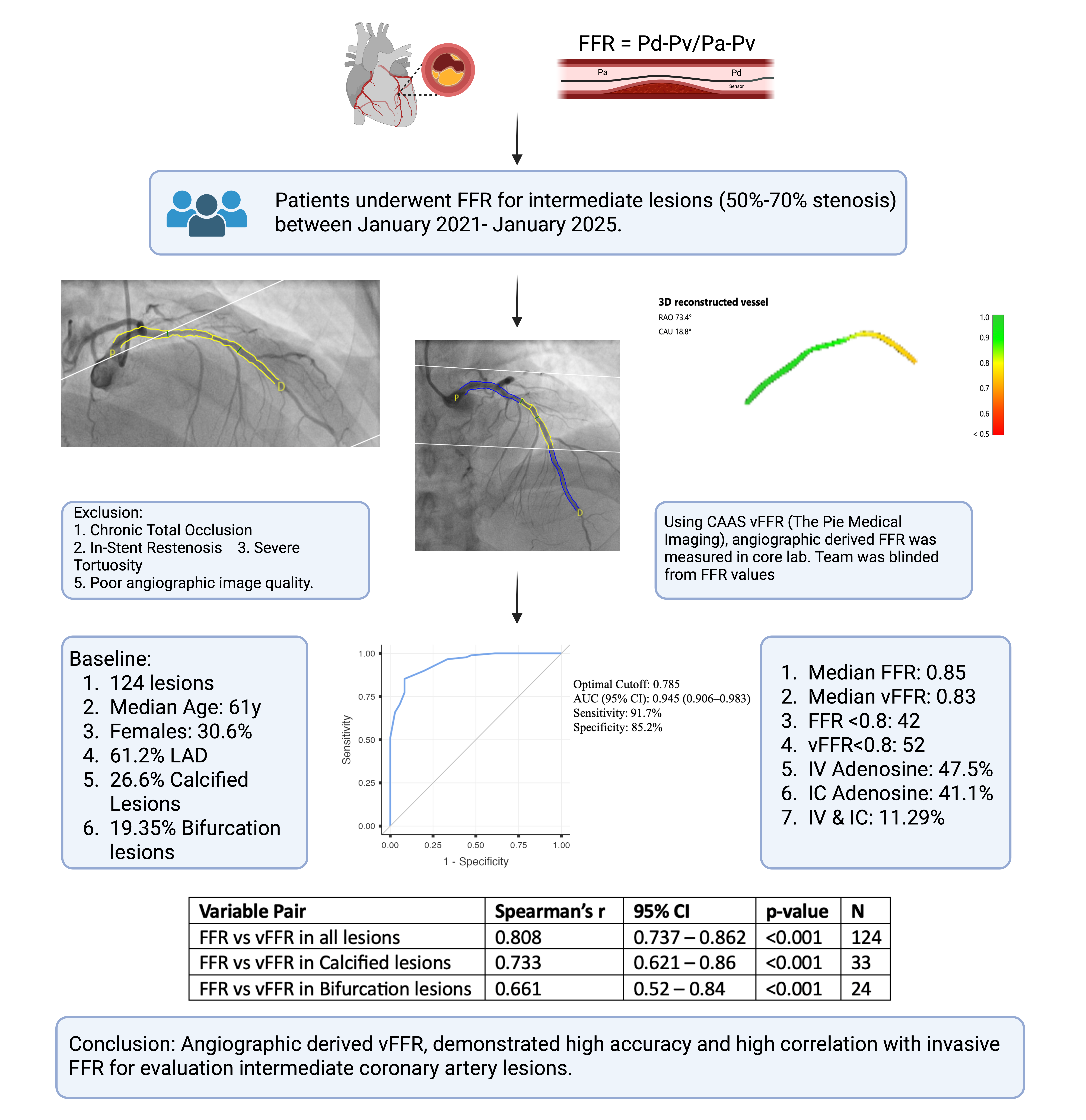 This study evaluated the concordance between angiography-derived vFFR and invasive FFR in patients with intermediate coronary stenosis. Retrospectively, coronary angiograms of patients who underwent adenosine based FFR from January 2022 until January 2025, for borderline lesions, were retrieved from the health management information system (HIMS) software and processed by a blinded core laboratory for vFFR computation. vFFR ¡Â0.80 denoted haemodynamic significance. The primary analysis was the correlation between vFFR and invasive FFR, assessed using Spearman¡¯s correlation coefficient. Diagnostic performance of vFFR for detecting FFR-positive lesions was assessed using receiver operating characteristic (ROC) curve analysis, with calculation of area under the curve (AUC), sensitivity, specificity. Univariate analysis was done using Mann Whitney U test (for continuous variables) and Chi Square test (for categorical variables). Binary logistic regression analysis was done. All statistical analyses were performed using SPSS version 29 (IBM Corp., Armonk, NY, USA). A two-sided p-value <0.05 was considered statistically significant.