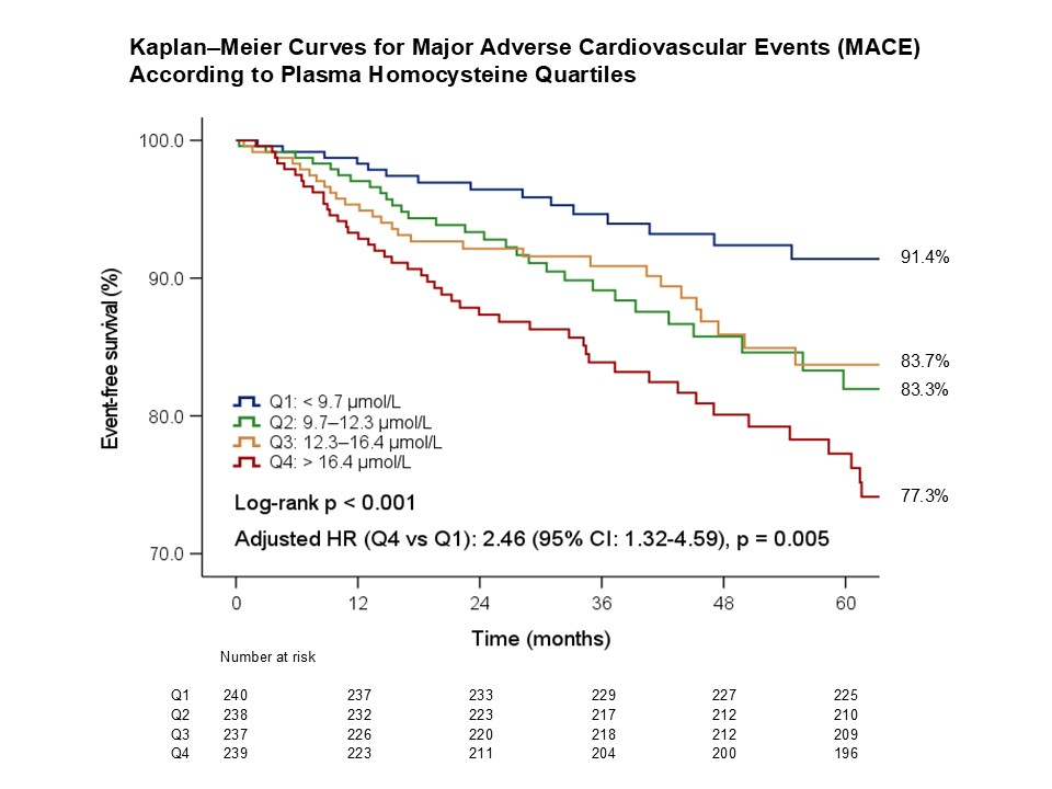 During a mean follow-up of 53.0 ¡¾ 39.5 months, 130 patients (13.3%) experienced MACE, including 7 deaths (0.7%), 14 nonfatal MI (1.5%), 20 ischemic strokes (2.1%), and 98 TLRs (10.3%). Secondary events included non-TLR in 263 patients (27.6%), HFH in 40 (4.2%), and arrhythmic events in 17 (1.8%). MACE incidence increased progressively across homocysteine quartiles (p < 0.001). Compared with the lowest quartile, the highest quartile had a significantly higher risk of MACE (adjusted HR: 2.46; 95% CI: 1.32–4.59; p = 0.005). Elevated homocysteine independently predicted all-cause death (p = 0.039), TLR (p = 0.006), non-TLR (p = 0.017), and HFH (p = 0.005), but not nonfatal MI (p = 0.706), ischemic stroke (p = 0.114), or arrhythmic events (p = 0.556).