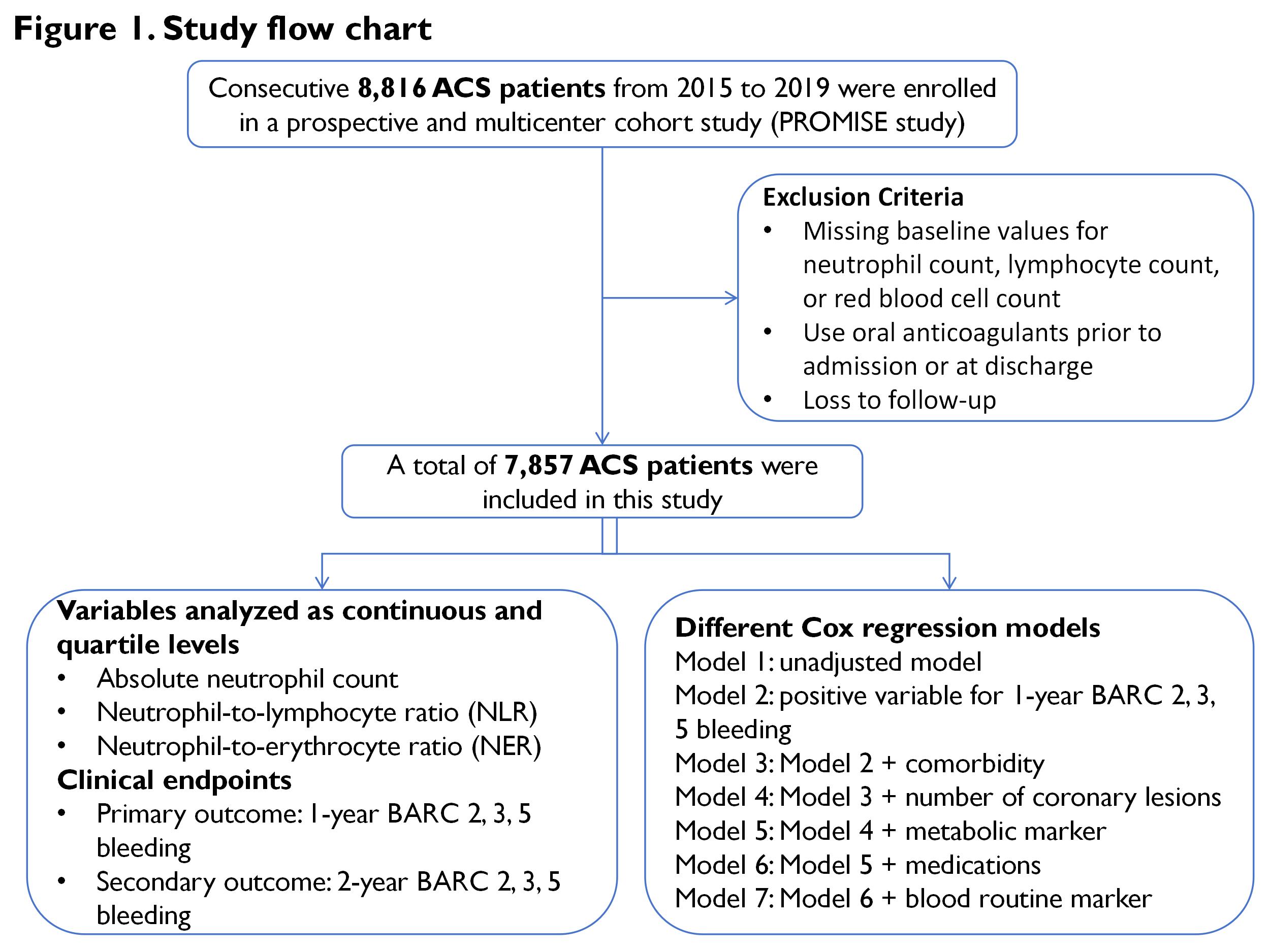 This study is a secondary analysis of a large, prospective, multicenter observational cohort in China. From 2015 to 2019, a total of 8,816 consecutive patients with ACS were enrolled and followed for 2 years (Figure 1). The absolute neutrophil count and its derived ratios, the neutrophil-to-lymphocyte ratio (NLR) and neutrophil-to-erythrocyte ratio (NER), were analyzed as both continuous and categorical (quartiles) variables. The primary endpoint was Bleeding Academic Research Consortium (BARC) types 2, 3, or 5 bleeding at 1 year, with 2-year bleeding as the secondary endpoint. Multivariable Cox proportional hazards models were used to adjust for relevant clinical covariates including platelet and hemoglobin.