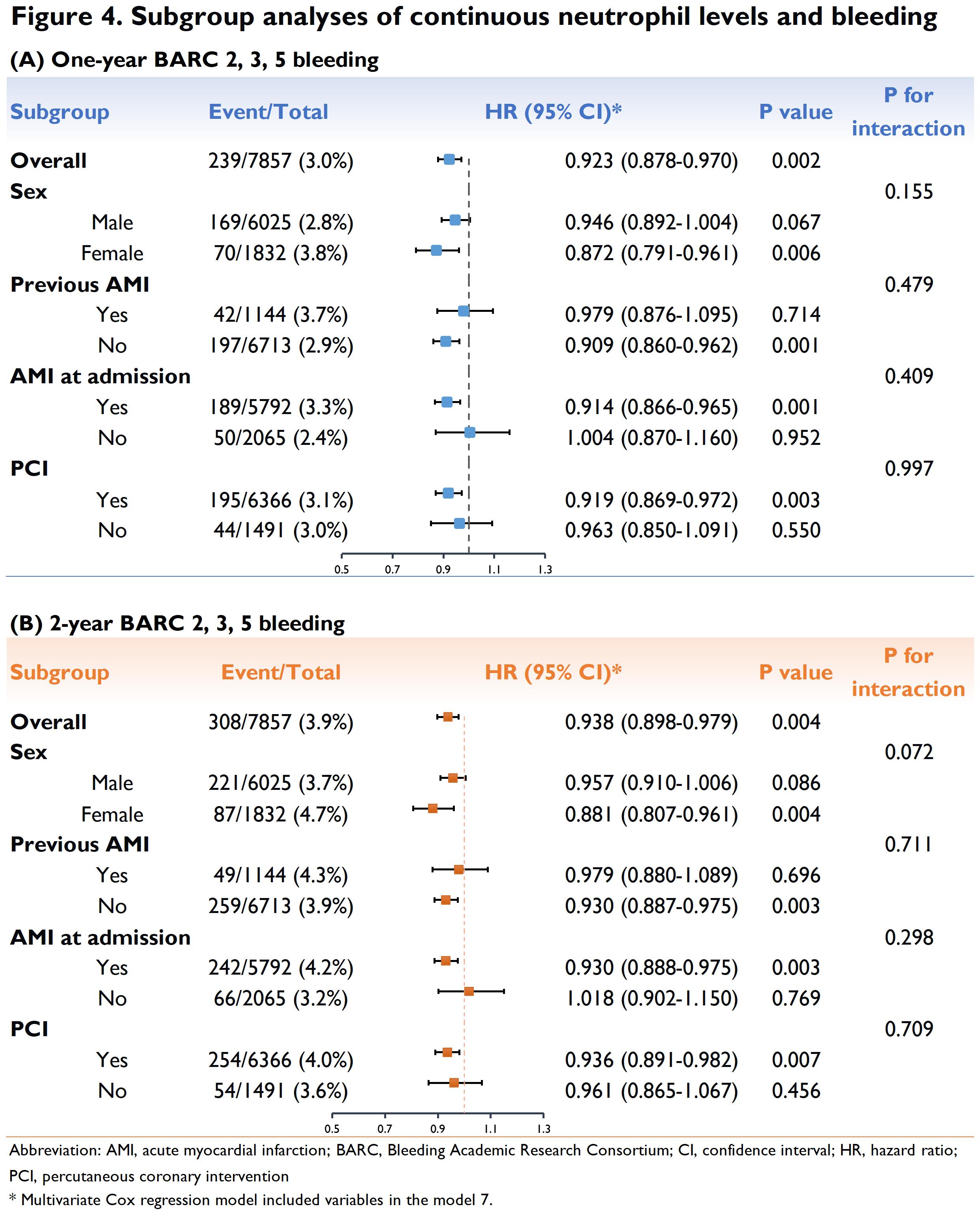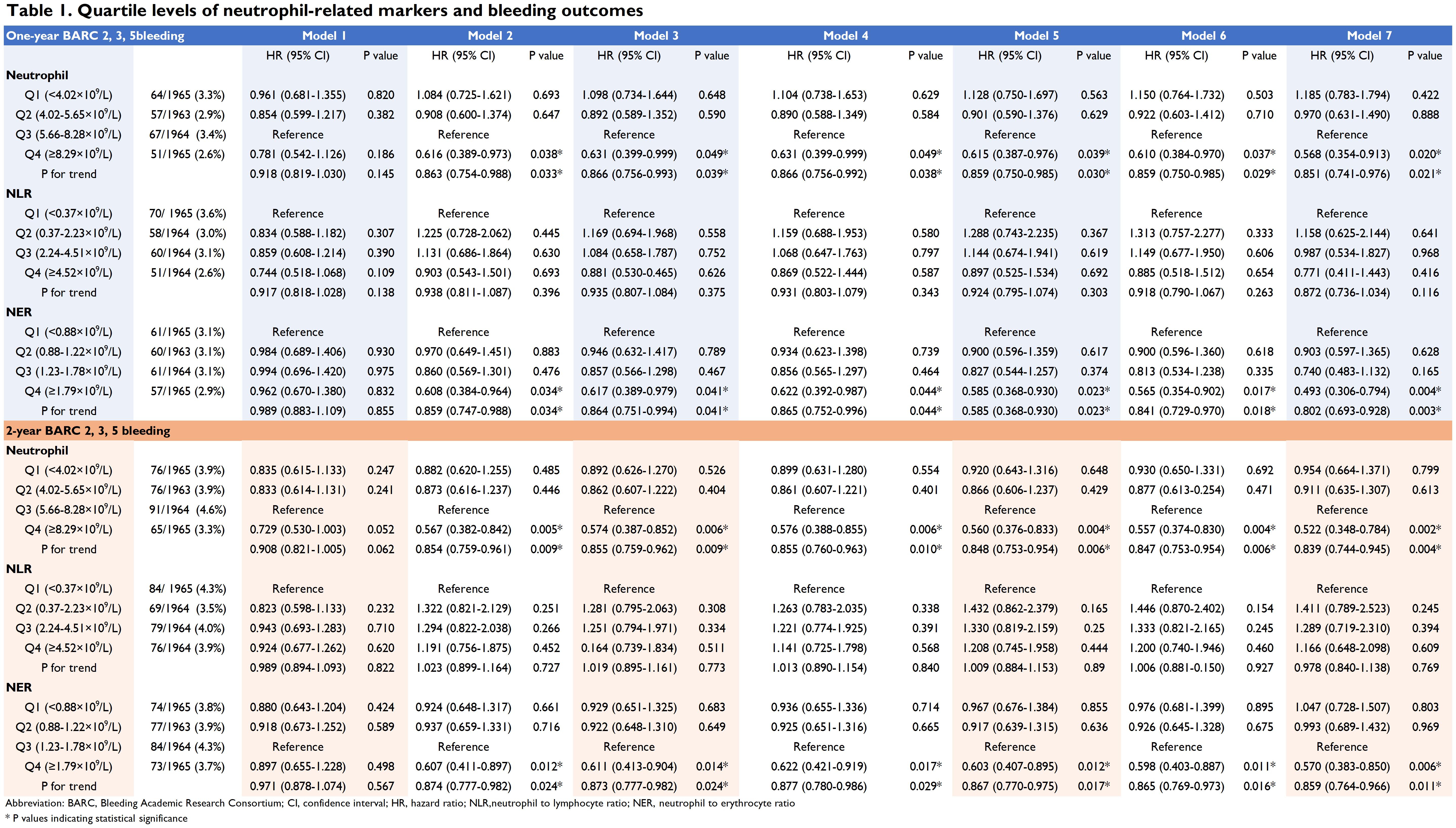 After excluding patients with missing baseline or follow-up data and those on oral anticoagulants, the final analytical cohort comprised 7,857 ACS patients. The study population had a mean age of 60.9 ¡¾ 11.4 years and was predominantly male (76.7%). During the follow-up period, 239 patients (3.0%) experienced BARC types 2, 3, or 5 bleeding events at 1 year, with the cumulative incidence increasing to 308 patients (3.9%) by 2 years. Restrictive cubic splines demonstrated a significant inverse association between neutrophil, NLR, NER, and the risk of 1- and 2-year bleeding (all p < 0.05) (Figure 2). In the fully adjusted Cox models, when analyzed as continuous variables, neutrophil, NLR, and NER were all independently associated with a reduced risk of 1-year and 2-year BARC 2, 3, 5 bleeding (Figure 3). When analyzed by quartiles, patients in the highest quartile (Q4) of absolute neutrophil count demonstrated substantially lower risks of bleeding, with hazard ratios of 0.568 (95% CI 0.354-0.913) for 1-year bleeding and 0.522 (95% CI 0.348-0.784) for 2-year bleeding (Table 1). Similarly, the highest quartile of NER was associated with reduced 1-year (HR 0.493, 95% CI 0.306-0.794) and 2-year bleeding risks (HR 0.570, 95% CI 0.383-0.850). Subgroup analyses confirmed the consistency of this inverse association across key subgroups (all p for interaction > 0.05) (Figure 4).