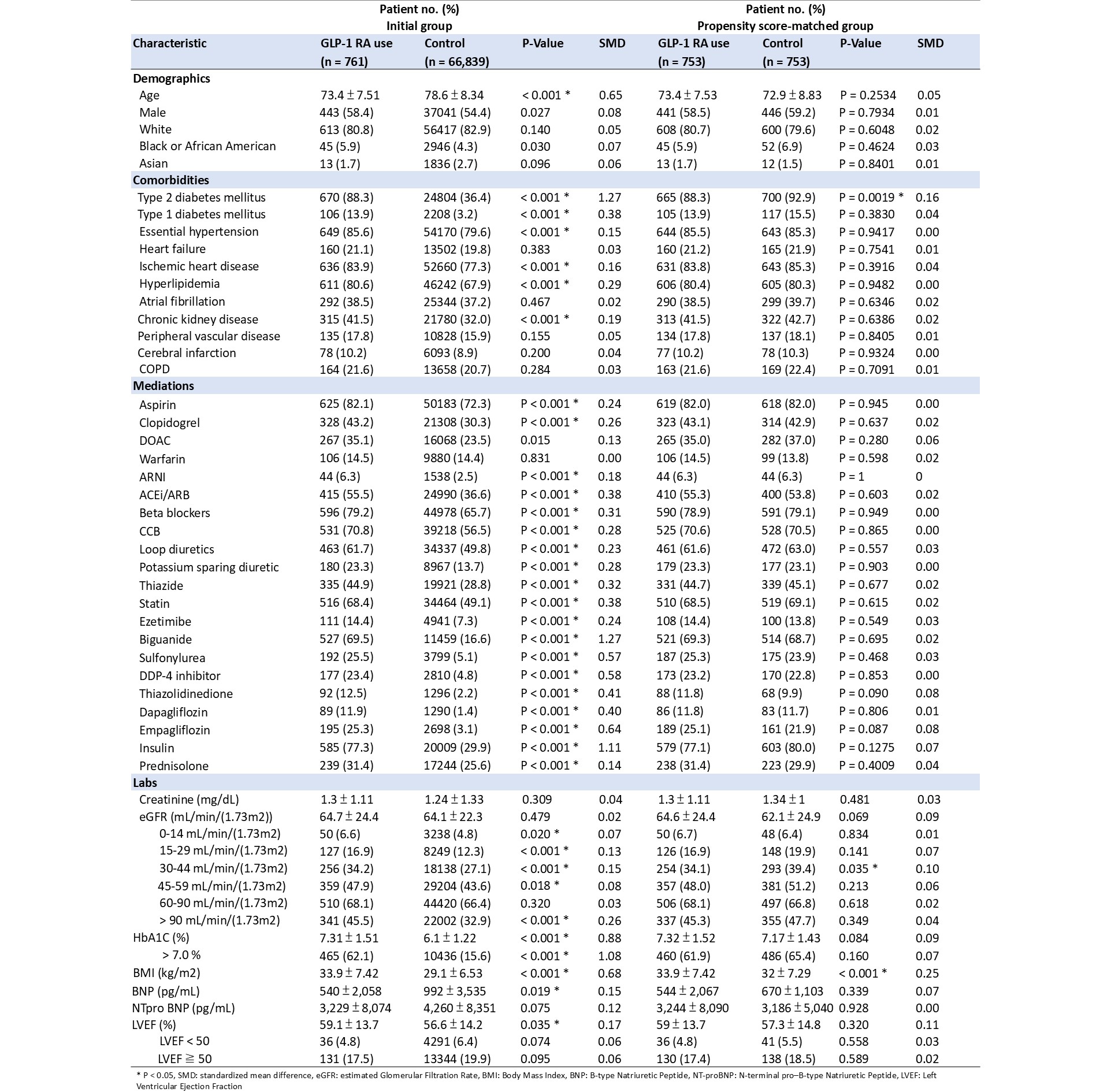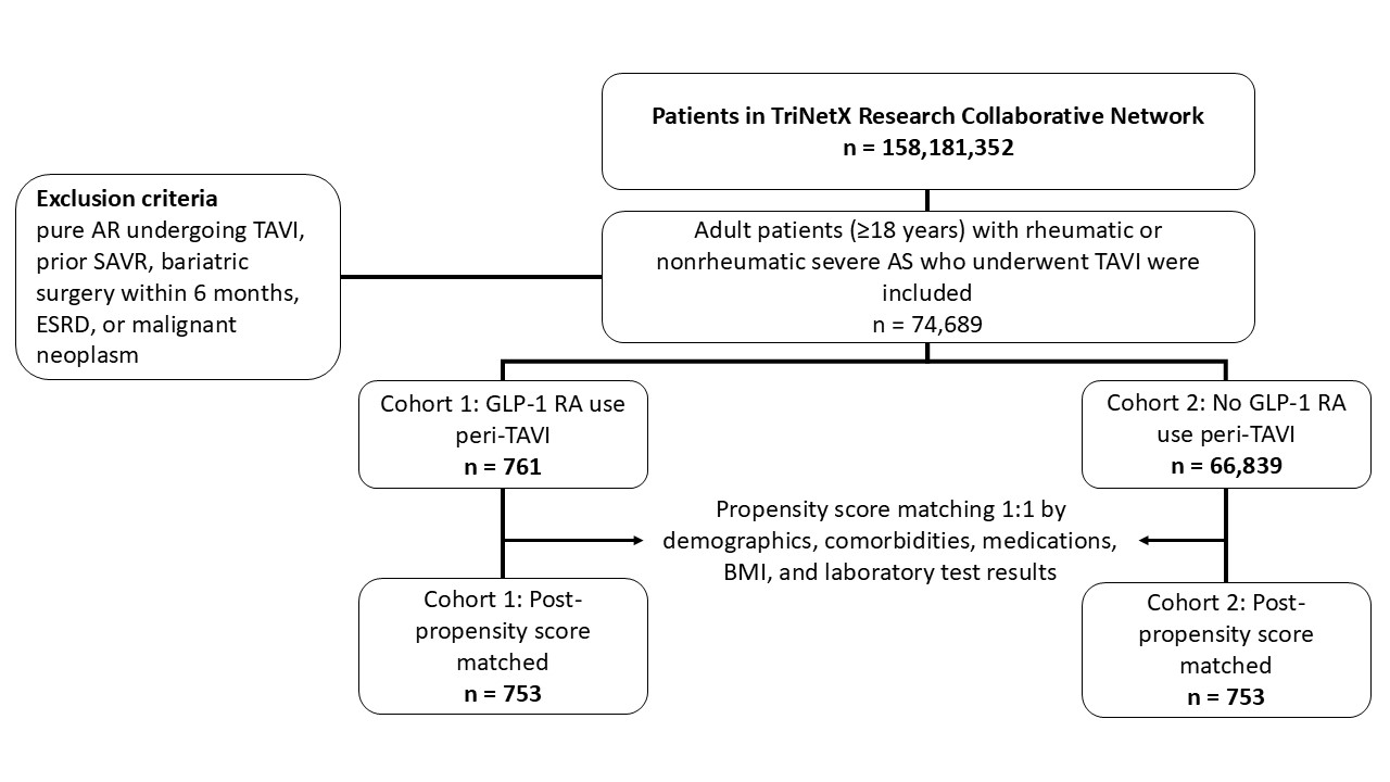 We used the TriNetX research network to identify adults (¡Ã18 years) with rheumatic or non-rheumatic severe aortic stenosis who underwent transcatheter aortic valve implantation (TAVI) between January 2010 and January 2024. Patients were excluded if they had pure aortic regurgitation, prior surgical aortic valve replacement, bariatric surgery within 6 months, end-stage renal disease, or malignant neoplasm. Patients were divided into two groups: (1) the GLP-1 receptor agonist (GLP-1 RA) group, defined as those prescribed semaglutide, liraglutide, dulaglutide, exenatide, or lixisenatide within 1 month before or up to 2 weeks after TAVI; and (2) the control group, defined as those who never received a GLP-1 RA from baseline through 1 year after TAVI. To reduce confounding, 1:1 nearest-neighbor propensity score matching without replacement was performed. Matching variables included demographics (age, sex, race), comorbidities (type 1 or 2 diabetes, hypertension, heart failure, ischemic heart disease, hyperlipidemia, atrial fibrillation, chronic kidney disease, cerebrovascular disease, peripheral vascular disease, COPD), medications (antiplatelets, anticoagulants, antihypertensives, diuretics, statins, glucose-lowering therapies, corticosteroids), and laboratory parameters (creatinine, eGFR, HbA1c, BMI, natriuretic peptides, LVEF). Standardized mean differences (SMD) <0.1 were considered well balanced. Follow-up began 14 days after TAVI and continued to 365 days. The primary outcome was all-cause mortality. Secondary outcomes were worsening heart failure, all-cause hospitalization, major adverse cardiovascular events, acute kidney injury, and pacemaker implantation. Safety outcomes were pancreatitis and diabetic ketoacidosis; nephrolithiasis served as a falsification endpoint. Kaplan–Meier curves with log-rank tests evaluated event-free survival. Cox proportional hazards models estimated hazard ratios with 95% confidence intervals. A two-sided p<0.05 was considered statistically significant. Analyses were performed using the TriNetX Analytics platform with de-identified electronic health record data.