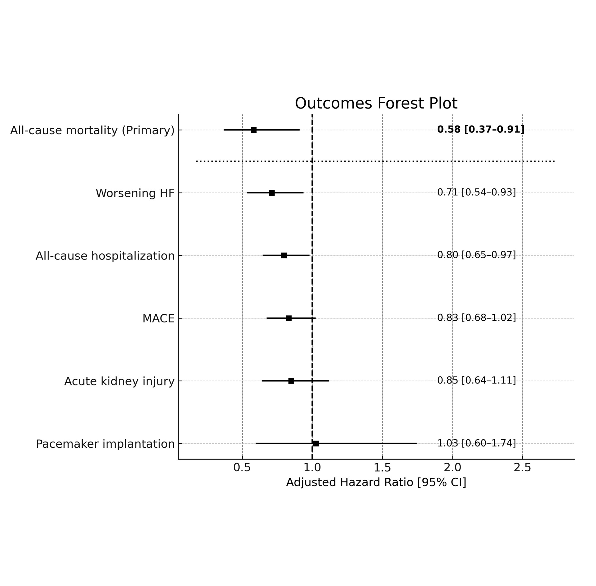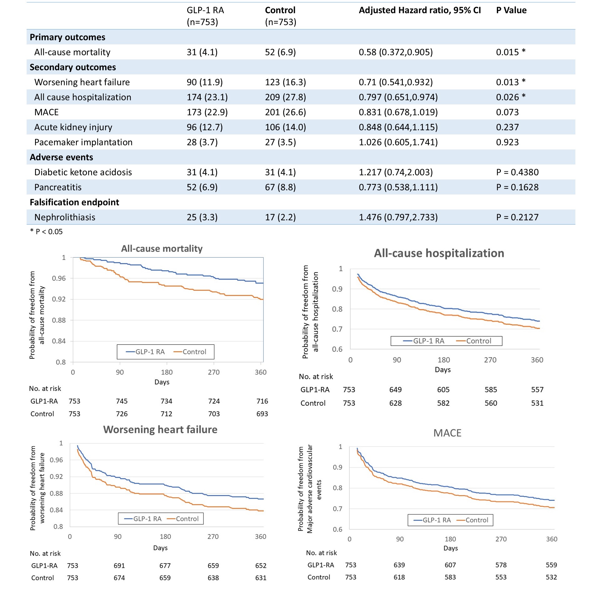 A total of 761 patients received a GLP-1 RA and 66,839 served as controls. After 1:1 propensity score matching, baseline demographics and most comorbidities were well balanced between groups. Residual differences included a higher prevalence of type 2 diabetes among GLP-1 RA users (92.9% vs 88.3%, p=0.0019), a greater proportion of patients with moderate CKD (eGFR 30–44 mL/min/1.73m©÷) in the control group (39.4% vs 34.1%, p=0.0359), and higher BMI in the GLP-1 RA cohort (33.9 ¡¾ 7.42 vs 32.0 ¡¾ 7.29 kg/m©÷, p<0.0001). During follow-up from day 14 to 1 year after TAVI, the primary endpoint of all-cause mortality was significantly lower in the GLP-1 RA group (4.1% vs 6.9%; adjusted HR 0.58, 95% CI 0.372–0.905; p=0.0151). GLP-1 RA use was also associated with reduced worsening heart failure (11.9% vs 16.3%; aHR 0.71, 95% CI 0.541–0.932; p=0.0131) and lower all-cause hospitalization (23.1% vs 27.8%; aHR 0.797, 95% CI 0.651–0.974; p=0.0263). There was a nonsignificant trend toward lower MACE (22.9% vs 26.6%; aHR 0.831, 95% CI 0.678–1.019; p=0.0739). Rates of acute kidney injury (12.7% vs 14.0%; aHR 0.848, p=0.2371) and pacemaker implantation (3.7% vs 3.5%; aHR 1.026, p=0.9235) did not differ between groups. Adverse events, including pancreatitis and diabetic ketoacidosis, were rare and comparable. The falsification endpoint of nephrolithiasis showed no difference, supporting the robustness of the findings.