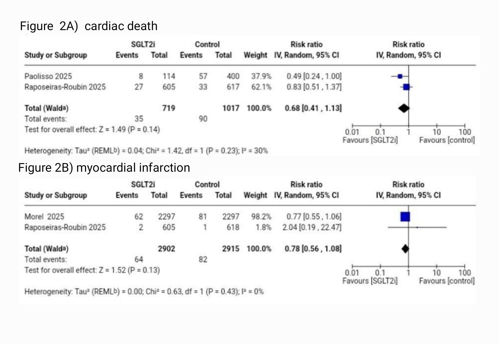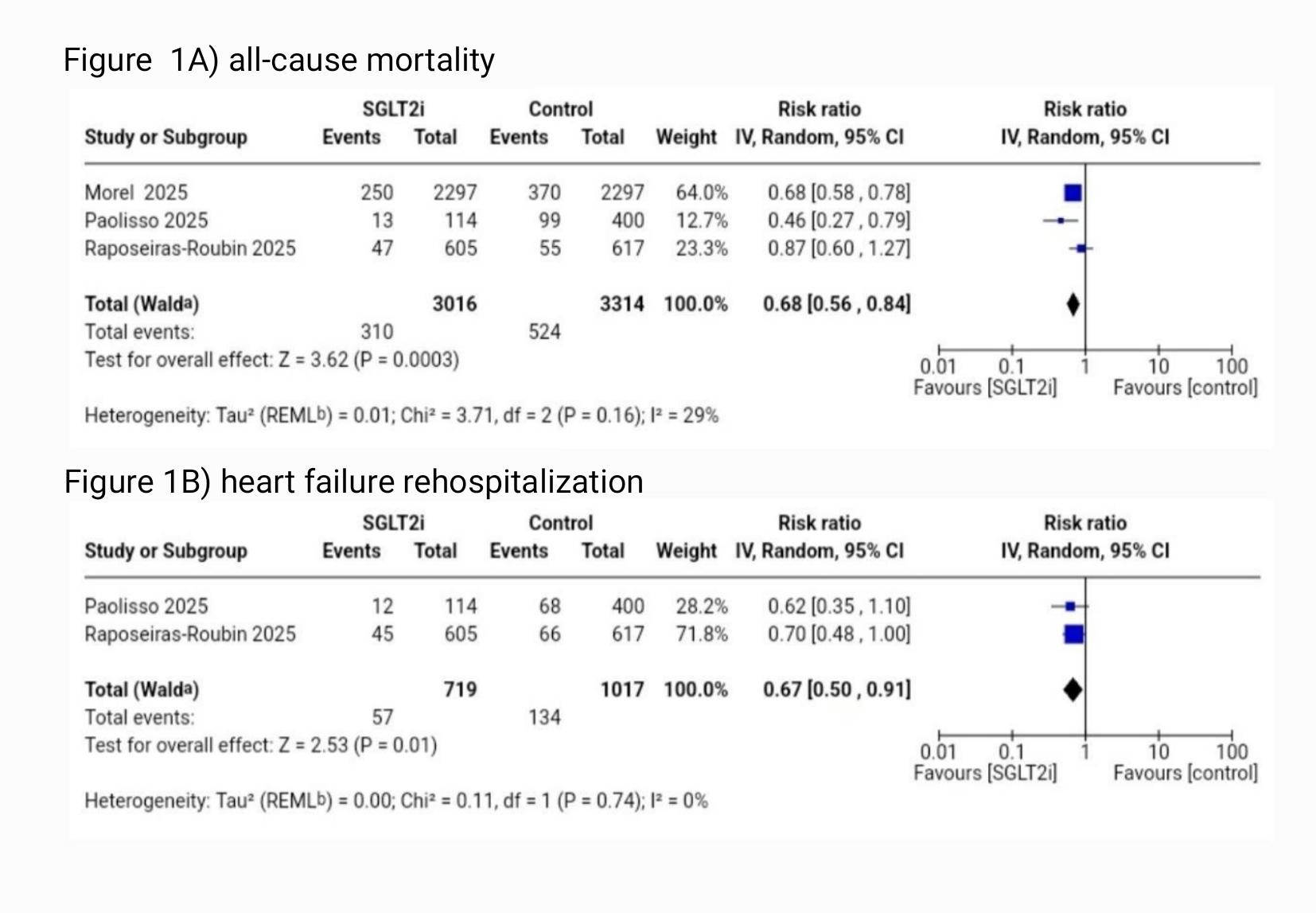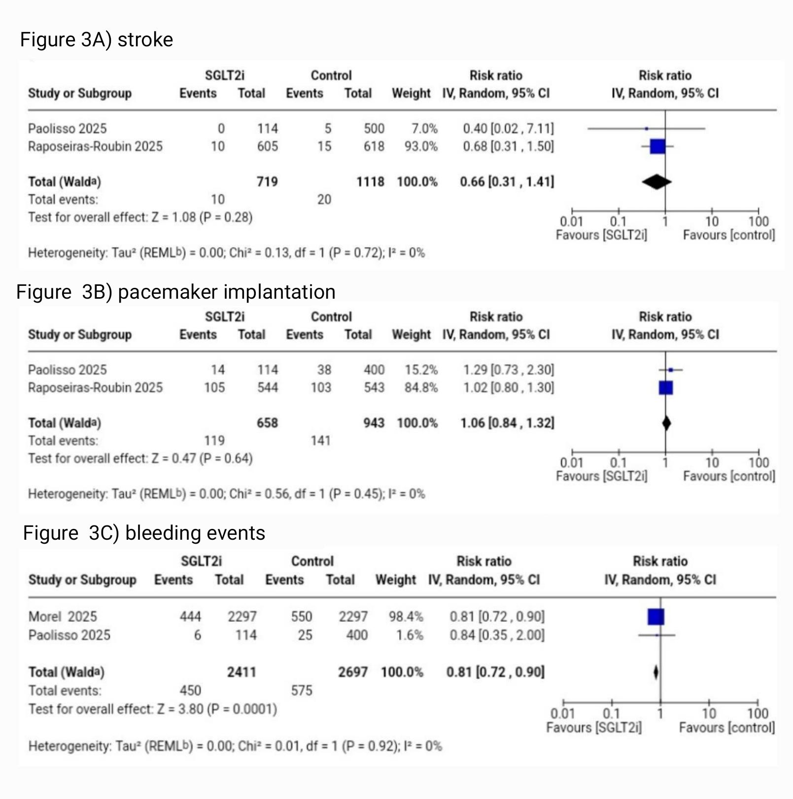 Results.Three studies (n = 6,330 patients)were included. SGLT2 inhibitor therapy reduced all-cause mortality (RR 0.68,95% CI 0.56–0.84; I©÷ = 29%, Figure 1A) and reduced heart failurehospitalization (RR 0.67, 95% CI 0.50–0.91; I©÷ = 0%, Figure 1B). TSA confirmedthat the accrued sample size exceeded the required information size for bothoutcomes. Bleeding events were also reduced (RR 0.81, 95% CI 0.72–0.90; I©÷ =0%, Figure 3C). Cardiac death (RR 0.68, 95% CI 0.41–1.13; I©÷=30%, Figure 2A),myocardial infarction (RR 0.78, 95% CI 0.56–1.08; I©÷=0%, Figure 2B), stroke (RR0.66, 95% CI 0.31–1.41; I©÷=0%, Figure 3A), and pacemaker implantation (RR 1.06,95% CI 0.84–1.32; I©÷=0%, Figure 3B) were not significantly different. GRADEcertainty was high for all-cause mortality, heart failure hospitalization, andbleeding, and moderate for cardiac death, myocardial infarction, stroke, andpacemaker implantation.