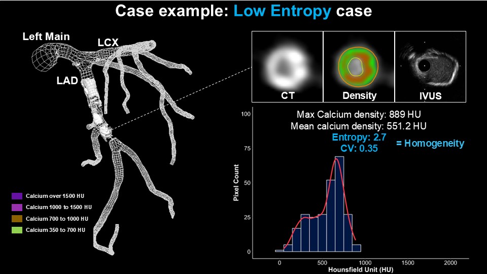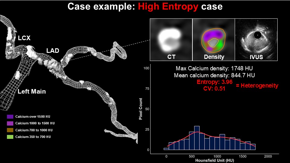 Circumferential coronary calcification is predominantly composed of high-density calcium yet exhibits significant internal heterogeneity. The coefficient of variation highlights substantial variability in calcium density within the calcified arc, while the observed entropy indicates a moderate-to-high non-uniformity in spatial distribution. These findings suggest that even morphologically concentric calcifications may harbor heterogeneous internal architecture, potentially influencing mechanical compliance and responsiveness to balloon dilatation.
