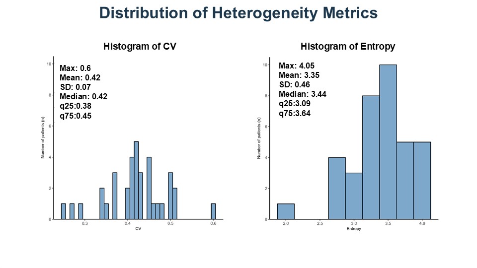 A total of 25 vessels from 23 patients with CCC were analyzed (mean age, 71 ¡¾ 6.4 years; 21 male). The maximum HU within calcified segments was 2,062, with a mean of 1,454 ¡¾ 332 and a median of 1,490 (IQR, 1,153–1,629). The density distribution within CCC demonstrated marked heterogeneity, with a CV of 0.40 ¡¾ 0.06. Shannon entropy values were 3.37 ¡¾ 0.50, reflecting non-uniformity in the spatial distribution of calcium density across the vessel circumference.