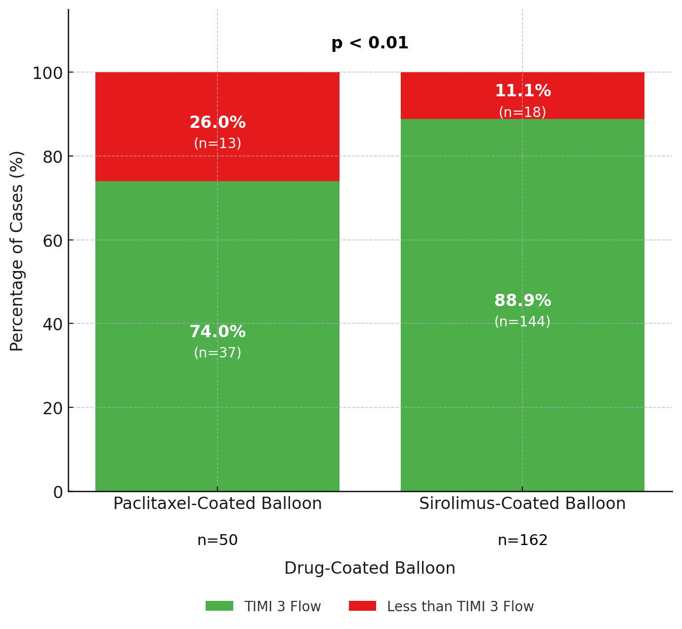 Final TIMI 3 flow was achieved in 74% of PCB and 88.9% of SCB cases (p < 0.01). Bailout stenting was infrequent (10% vs 8% respectively). Mean DCB diameter and length were comparable between the two cohorts (Diameter: 2.745 mm vs 2.801 mm; Length: 28 mm vs 27.5 mm, respectively). No significant differences were observed in lesion preparation techniques, including the use of non-compliant/semi-compliant balloons, cutting balloons, or intravascular imaging (IVUS/OCT).