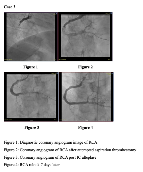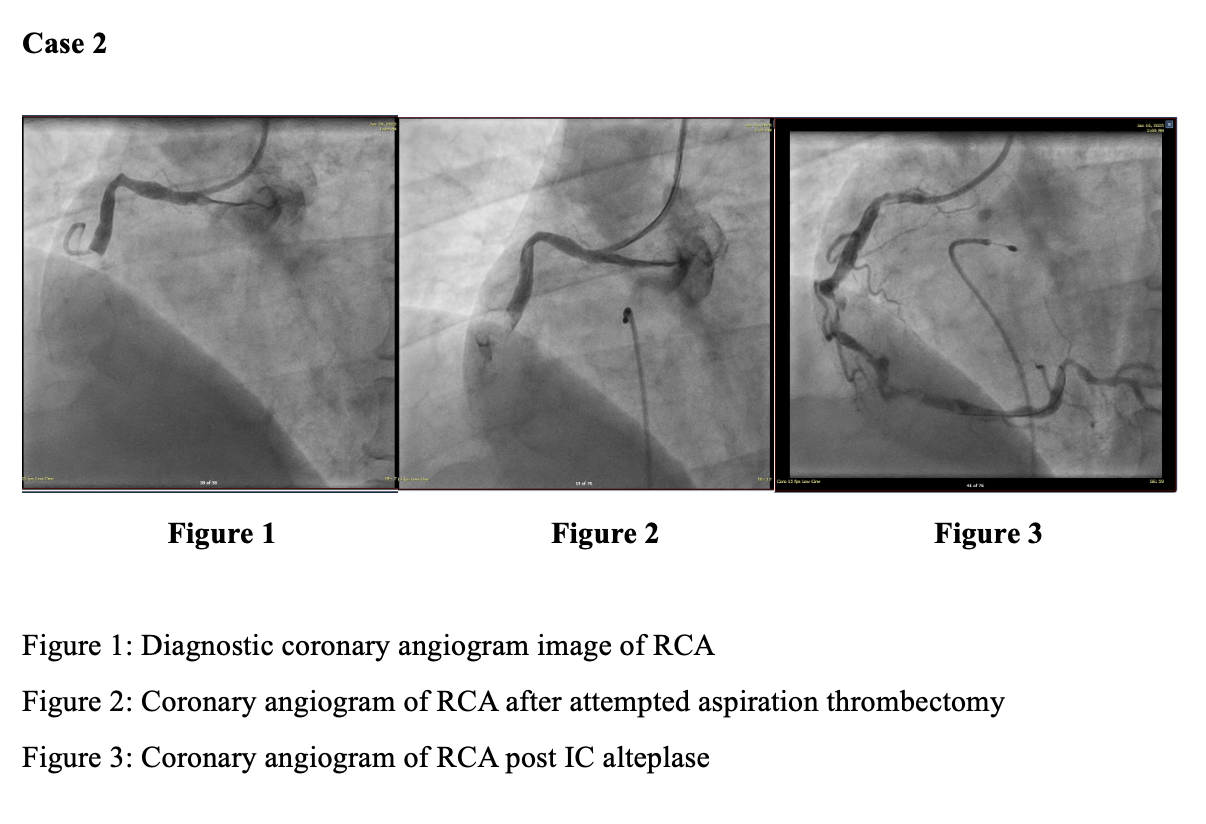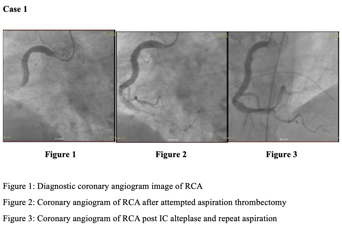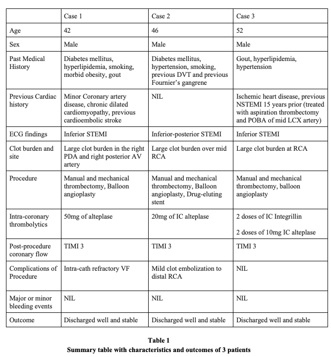 Three STEMI patients with angiographically confirmed large thrombus burden underwent primary PCI with dual-antiplatelet therapy (DAPT) and weight-adjusted unfractionated heparin (100 U/kg). Mechanical and/or manual aspiration thrombectomy was attempted but failed to restore adequate flow. Intracoronary alteplase (10–50 mg total) was delivered via aspiration or a microcatheter in fractional boluses, guided by angiographic response, followed by repeat aspiration and ballooning as indicated. Procedural success, TIMI flow, stent deployment, hemodynamic support requirements, and bleeding events were recorded.