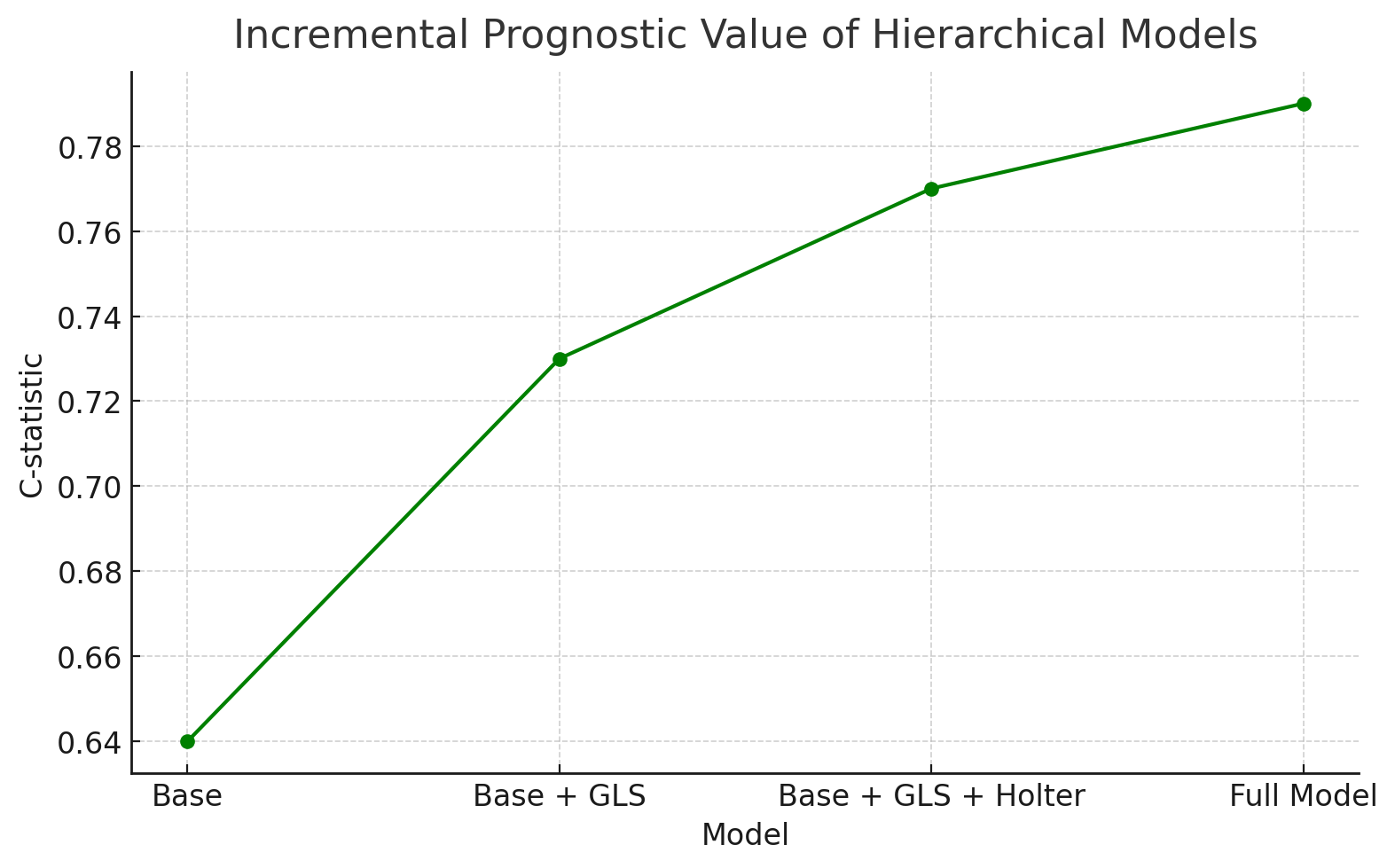 At 12 months, MACE occurred in 36 patients (18.0%). In an adjusted multivariable Cox regression model, impaired GLS (HR:1.18 per 1% worsening; 95% CI: 1.09-1.28), the presence of non-sustained ventricular tachycardia (NSVT) (HR: 2.41; 95% CI: 1.52-3.83), and log-transformed NT-pro BNP (HR: 1.55 per 1-SD increase; 95% CI: 1.24-1.93) were all significant, independent predictors of MACE (all p< 0.001). LVEF was not an independent predictor (p = 0.34). Adding this multi-marker panel to a base model (clinical factors + LVEF) significantly improved the C-statistic (from0.64 to 0.79; p < 0.01) and net reclassification (NRI: 0.38; p < 0.001). Full Model = Base + GLS + Holter + Biomarkers.C-Statistic = Concordance Statistic