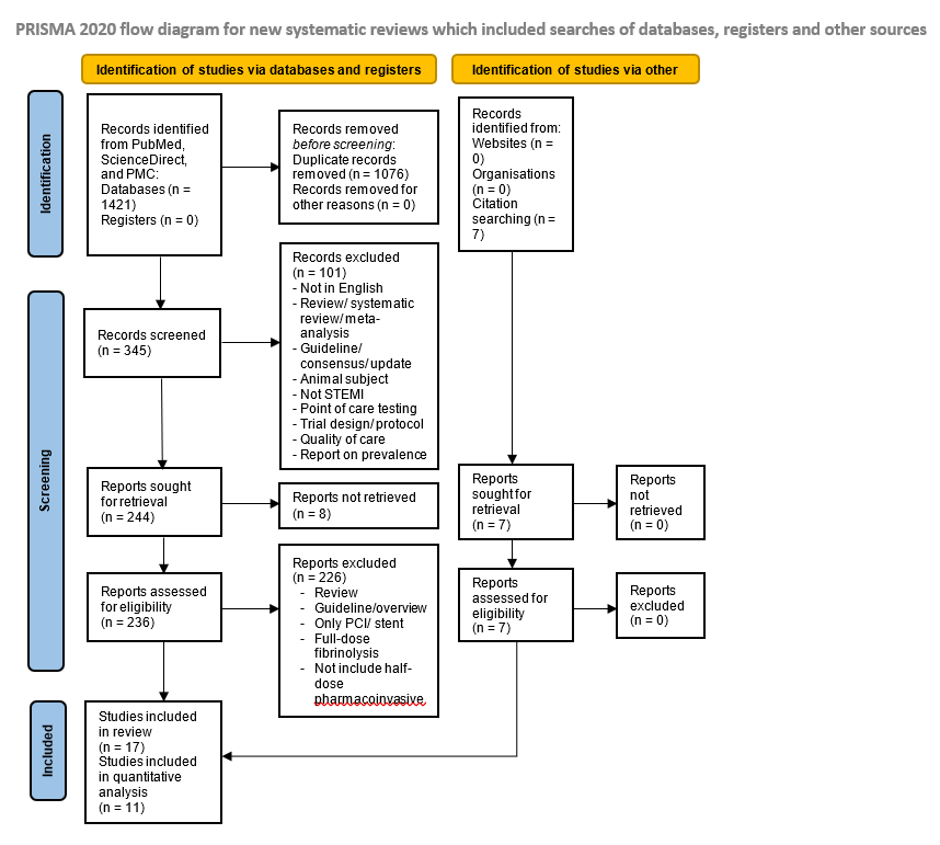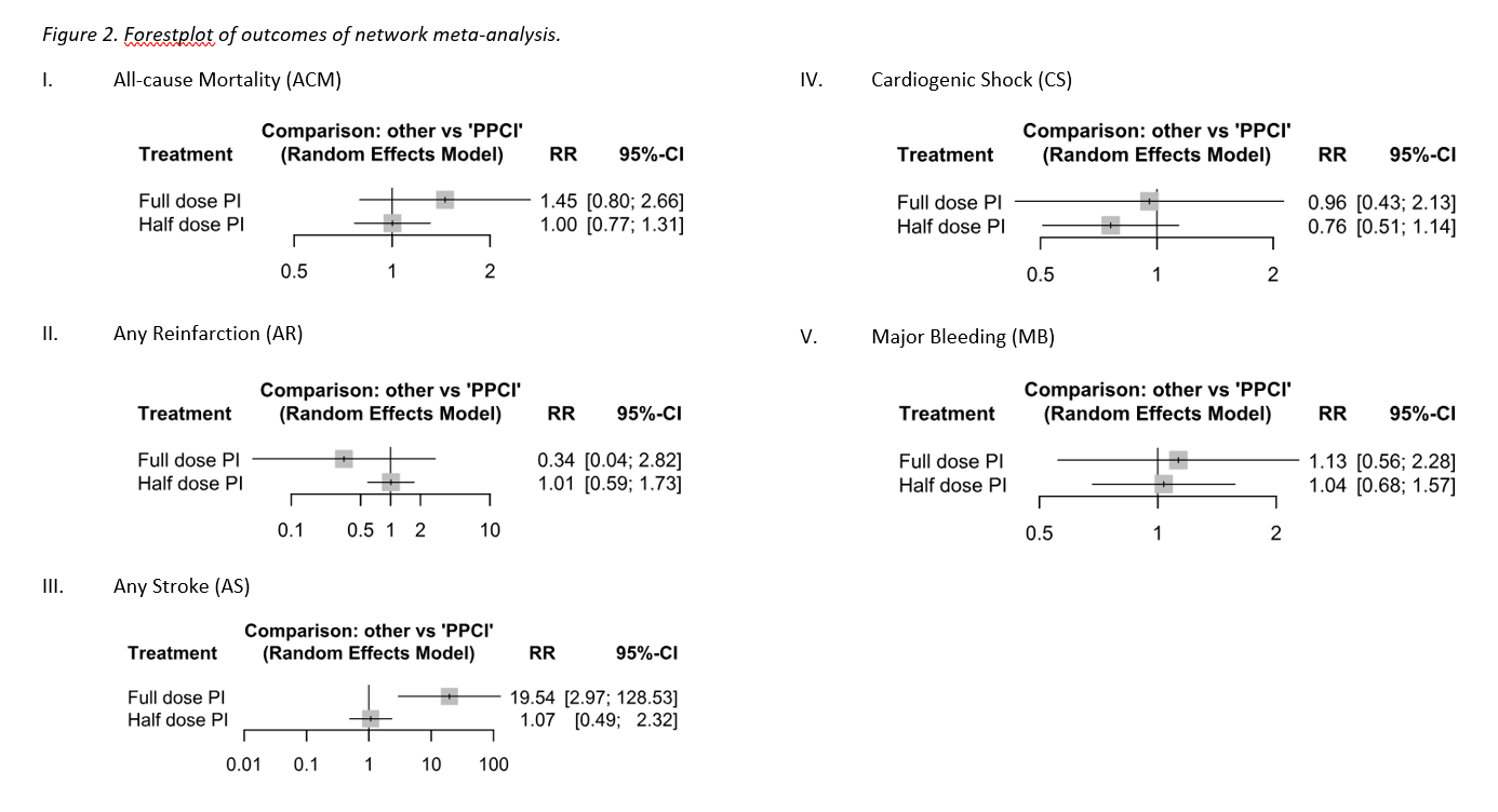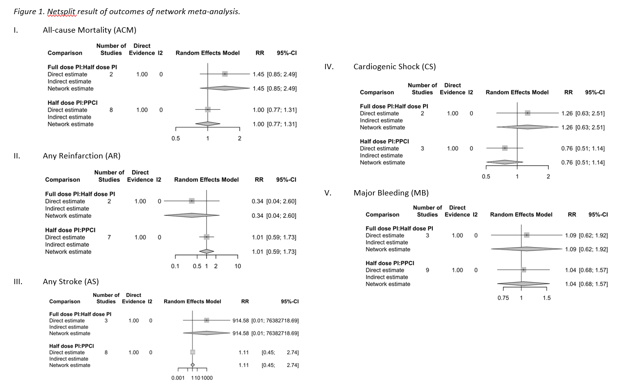 A systematic literature search following PRISMA guidelines was conducted across PubMed, PMC, and ScienceDirect for studies (2003-2025) evaluating half-dose PI therapy in STEMI. Eligible randomized, interventional, and observational studies reporting clinical outcomes were included. Pooled risk ratios were calculated using a random-effects model through pairwise meta-analysis and frequentist network meta-analysis (NMA) comparing short-term outcomes (¡Â 30 days) among half-dose PI, full-dose PI, and PPCI.