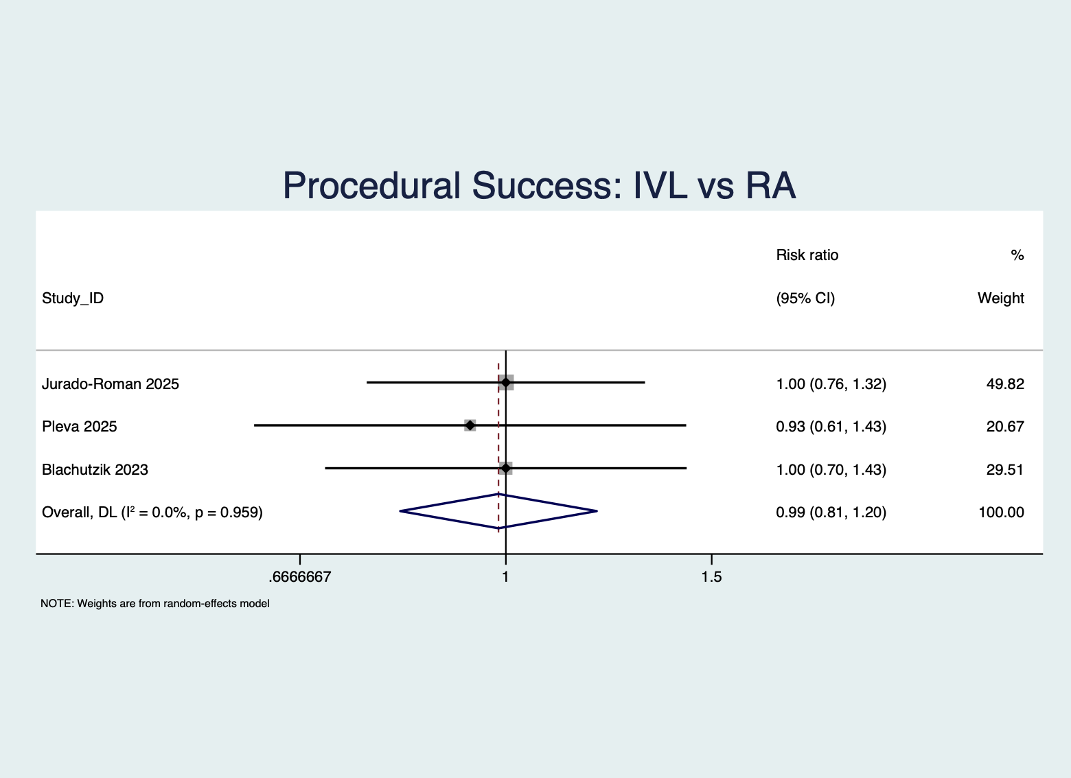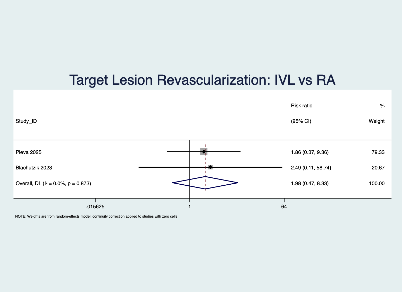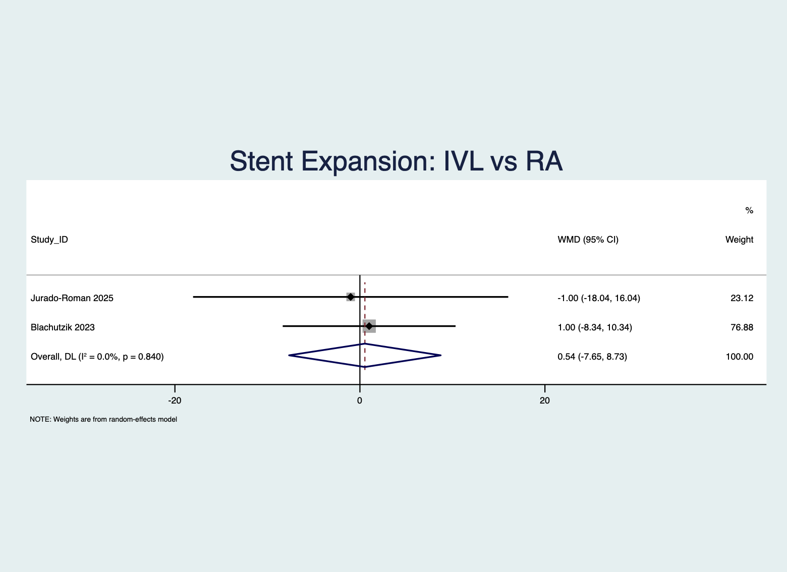Three RCTs comprising a total of 225 patients were included. Meta-analysis of procedural success demonstrated no significant difference between IVL and RA (RR 0.99, 95 % CI 0.81 – 1.20; p = 0.88; I©÷ = 0 %). Two studies involving 111 participants reported target lesion revascularization (TLR), with no statistically significant difference between IVL and RA (RR 1.98, 95 % CI 0.47 – 8.33; p = 0.35; I©÷ = 0 %). A random-effects meta-analysis of two studies (n = 175) assessing stent expansion also revealed no significant difference between IVL and RA (WMD 0.54 %, 95 % CI −7.66 to 8.73; p = 0.90; I©÷ = 0 %).