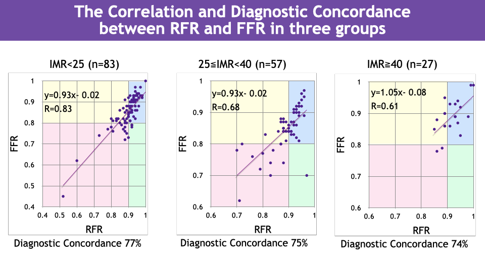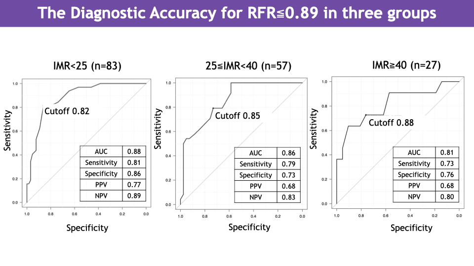 We analyzed 167 consecutive lesions in the left anterior descending artery for which RFR, FFR, and IMR were measured. The cases were divided into three groups according to IMR: high-IMR group (IMR ¡Ã 40), moderate-IMR group (25 ¡Â IMR < 40), and normal-IMR group (IMR < 25). For each group, we calculated the correlation coefficient between RFR and FFR, the diagnostic concordance rate, and conducted receiver-operating characteristic (ROC) analysis to assess the diagnostic performance of FFR in predicting RFR ¡Â 0.89, including determination of the optimal FFR cut-off value.