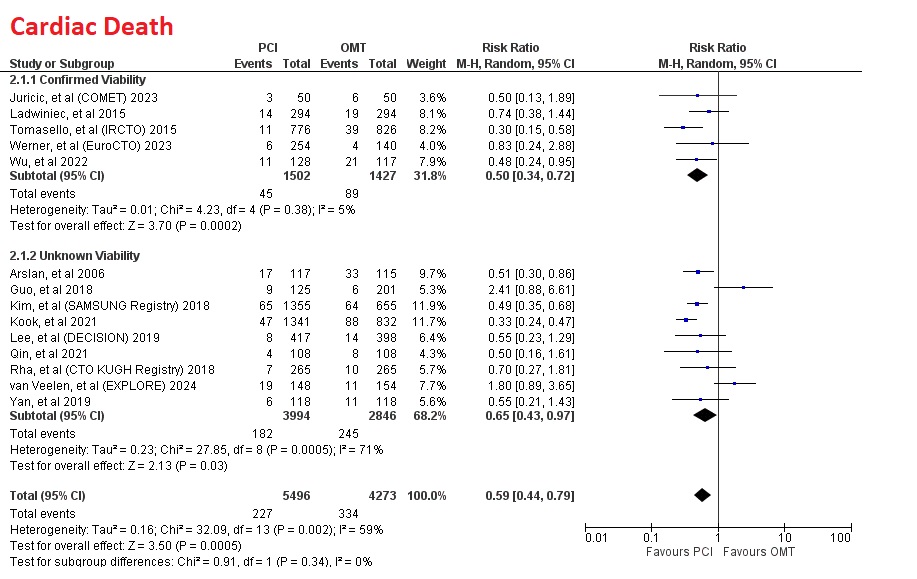 Compared to immediate OMT, overall PCI significantly reduce all cause death (RR=0.62 [95% CI, 0.49-0.77], p<0.0001), cardiac death (RR=0.59 [95% CI, 0.44-0.79], p=0.0005) and MACE (RR=0.78 [95% CI, 0.62-0.98], p=0.03).