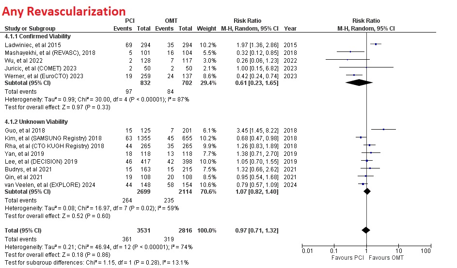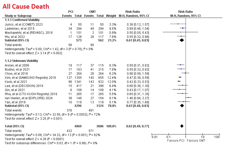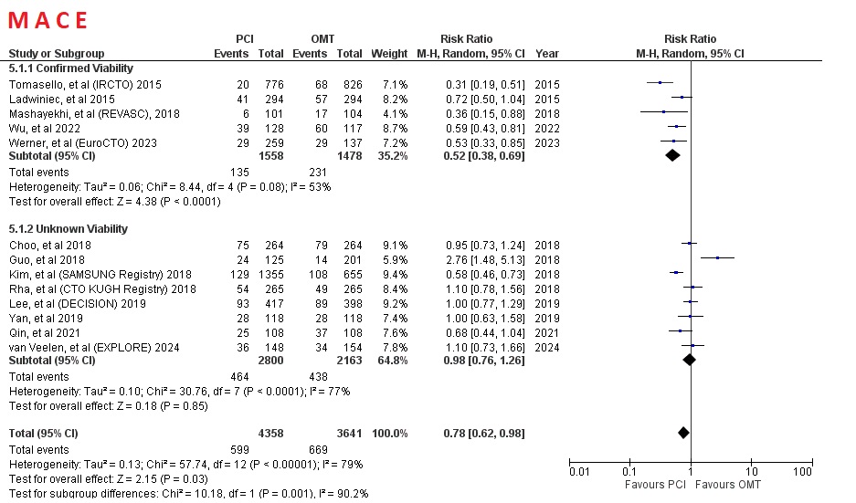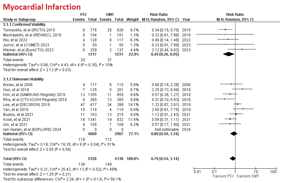 Interestingly, subgroup of studies which performed viability test before PCI had more significant result compar ed to subgroup who did not. Compared to subgroup which do not mandatory viability test, subgrouup which confirmed myocardial viability had more significant reduction in MACE (RR=0.52 [95% CI, 0.38-0.69], p<0.0001) versus (RR=0.98 [95% CI, 0.76-1.26], p=0.85) and myocardial infarction (RR=0.49 [95% CI, 0.26-0.95], p=0.03) versus (RR=0.89 [95% CI, 0.59-1.34], p=0.58)