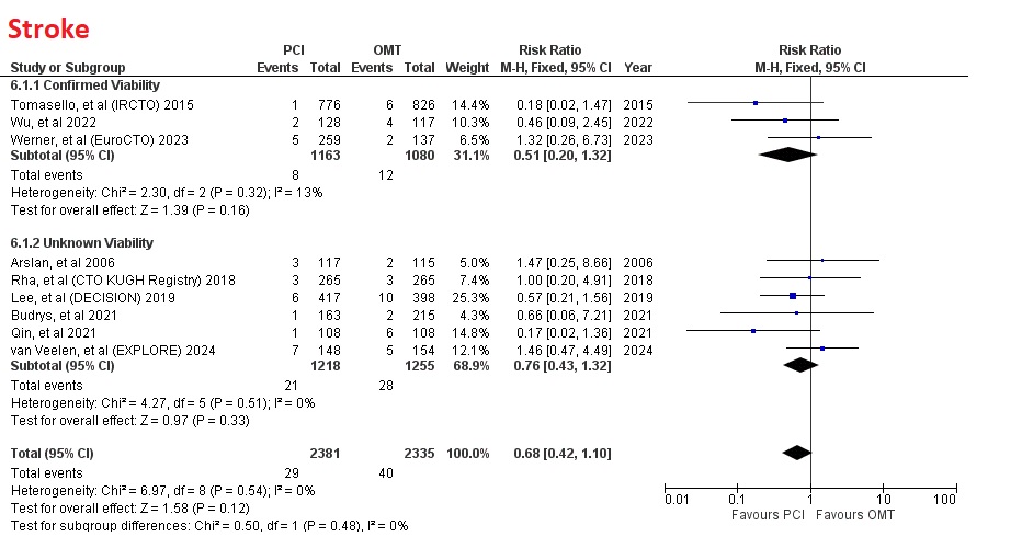However, PCI had no significant difference in myocardial infarction (RR=0.79 [95% CI, 0.54-1.14], p=0.21), any revascularization (RR=0.97 [95% CI, 0.71-1.32], p=0.86), and stroke (RR=0.68 [95% CI, 0.42-1.10], p=0.12)