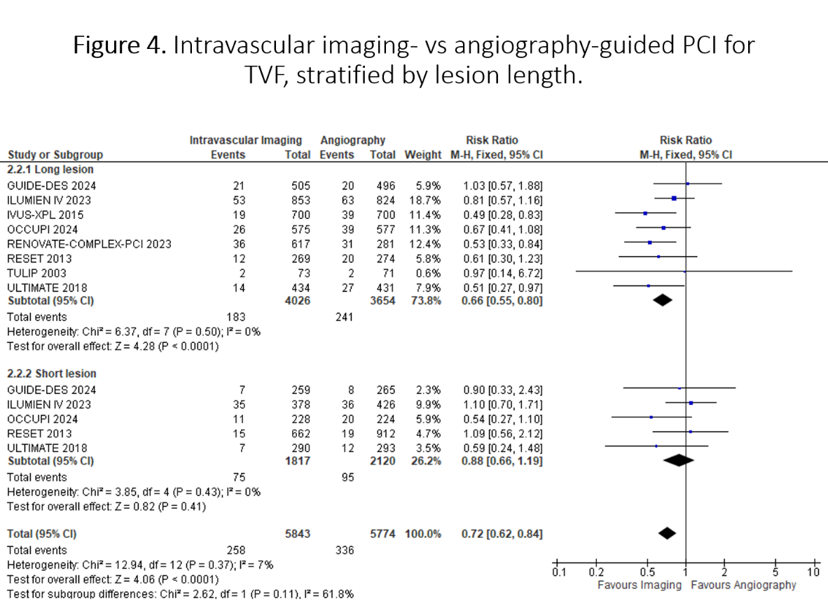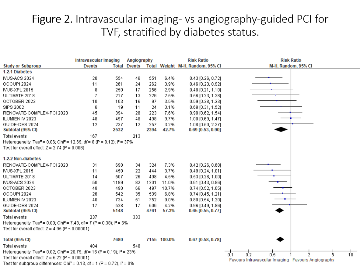 This novel meta-analysis of RCTs demonstrates that intravascular imaging-guided PCI significantly reduces TVF, with consistent benefits across diabetes status. The treatment effect is particularly pronounced in long lesions, while OCT and IVUS show comparable efficacy. These findings support broader implementation of intravascular imaging, especially in patients with diabetes and those with long coronary lesions.