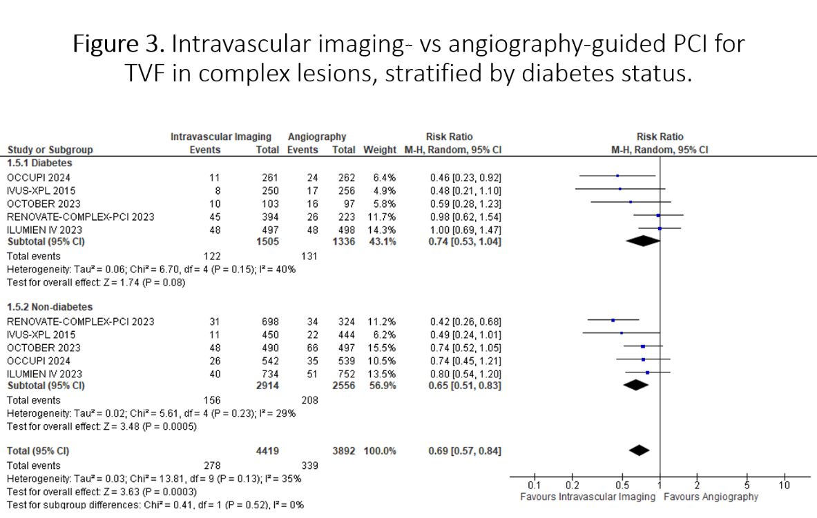 Thirteen RCTs (n=18,379) were included. Intravascular imaging significantly reduced TVF by 33% compared to angiography (RR 0.67, 95% CI 0.58-0.78; p<0.001), with consistent benefits in both patients with diabetes (RR 0.69, 95% CI 0.53-0.90; p=0.006) and without diabetes (RR 0.65, 95% CI 0.55-0.77; p<0.001; p-interaction=0.72). The treatment benefit was consistent across complex PCI populations and with both IVUS and OCT guidance. In diabetic patients undergoing complex PCI (RR 0.74, 95% CI 0.53-1.04) or receiving OCT guidance (RR 0.70, 95% CI 0.42-1.16), point estimates favored intravascular imaging but did not reach statistical significance. In direct head-to-head comparison, OCT demonstrated similar TVF risk to IVUS (RR 1.01, 95% CI 0.65-1.55; p=0.97), with consistent results across diabetes status. Analysis by lesion length revealed substantial benefit in long lesions (RR 0.66, 95% CI 0.55-0.80; p<0.0001) compared to short lesions (RR 0.88, 95% CI 0.66-1.19; p=0.41; p-interaction=0.11). Meta-regression analysis identifies age and follow-up duration as significant effect modifiers for TVF in diabetes.