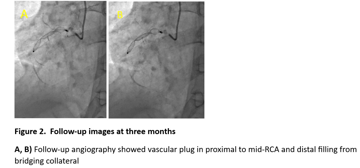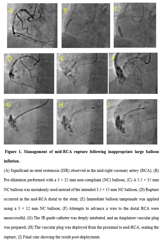 Given the significant ISRin the RCA, the plan was to treat it using a drug-eluting balloon (DEB). Initial pre-dilatation was performed with a 3 ¡¿ 12 mmsemi-compliant (SC) balloon at 18 atm. (Figure 1B). As the stent size was 3.5mm, the plan was to proceed with a 3.5¡¿15 mm non-compliant (NC) balloon beforeapplying the DEB. However, a 5.5 ¡¿ 15 mm NC balloon was mistakenly selected(Figure 1C). Subsequent angiography confirmed the rupture. (Figure 1D). A 3 ¡¿ 12mm balloon was immediately used for tamponade at 16 atm, and protamine sulfatewas administered to reverse heparin¡¯s effects (Figure 1E). Despite multiple attempts, rewiring the distal RCA was unsuccessful, andthe wire entered the pericardium (Figure 1F). On-tableechocardiography confirmed mild pericardial effusion. Coil embolization wasdeemed unsuitable due to the artery¡¯s size and rupture location. The onlyavailable option was to use a vascular plug. A9-AVP2-010 Amplatzer vascular plug was deployed in the proximal RCA to seal therupture. (Figure 1G-I) Following the procedure, the patient wasmonitored in the cardiac ICU, with serial echocardiograms confirming stablepericardial effusion. At three months, the angiography check revealed vascular plug in the RCA, with distal filling from bridging collaterals (Figure 2A, B).