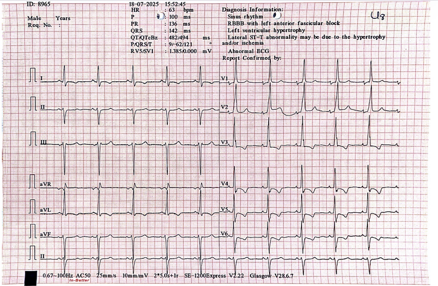Electrocardiography showed ST-segment depression with T wave inversion at V3-V6, DI, and aVL. Heart ultrasound found hypokinesia of anterior, septal, lateral and apical segment of LV wall with reduced LV systolic function (LVEF 35%), with normal LV filling pressure.Troponin-T was elevated at 0.314 ng/ml. Rest of the laboratory parameters were within normal range.