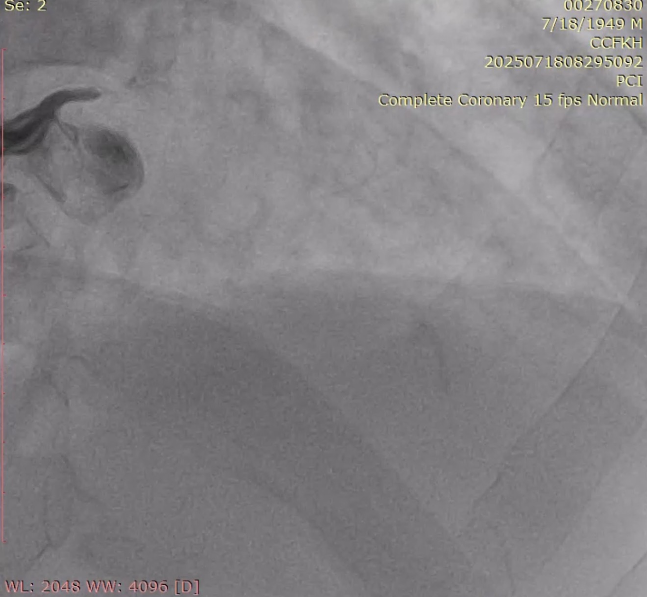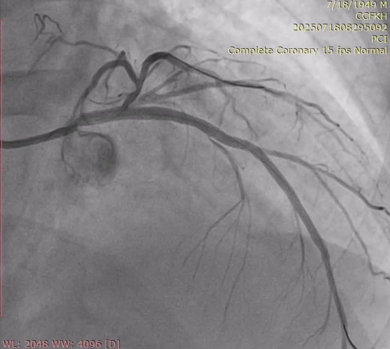 Urgent coronary angiography was performed by using right radial artery approach, which surprisingly showed left main coronary artery (LMCA) total occlusion with TIMI 0 flow. Right coronary artery has no significant stenosis with presence of excellent collaterals flow to the total left coronary system (Rentrop-3).