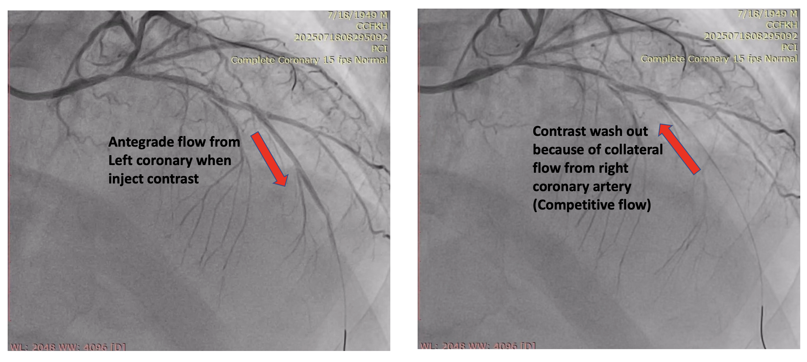 The left main was engaged by 6F EBU 3.5 via radial sheath. The LM occlusion was crossed by using workhorse guidewire (Cougar XT), suggesting an acute occlusion. Predilation with SC balloon (Sprinter Legend 1.5 x 12mm and Sprinter Legend 2.5 x 12mm) was performed at the occlusion site, resulting an antegrade flow from LM, but there was still no flow distally from mid-LAD.Plain old balloon angioplasty by Sprinter Legend 2.5 x 12mm performed at the mid-LAD, the flow from mid-LAD still was not achieved, giving the hypothesis of no reflow phenomenon. IC Nitroglycerine 100ug and IC Nicardipine 100ug were given several times, resulting a vasodilation and a better flow. It therefore revealed a significant competitive flow from powerful collaterals from the right coronary artery, ruling out the no reflow hypothesis (Refer to videos below for better illustration). Onyx Trucor DES 2.75 x 34mm, Onyx Trucor DES 3.0 x 22mm, and Onyx Trucor DES 3.5 x 22mm were implanted respectively from distal LAD to LM, and restored final TIMI 3 flow result
