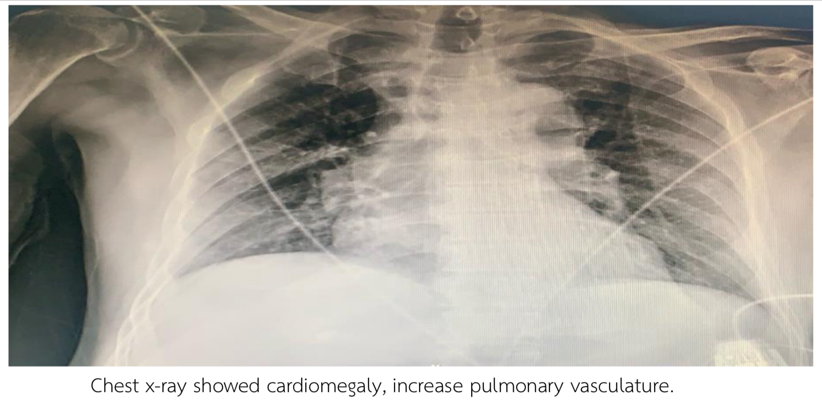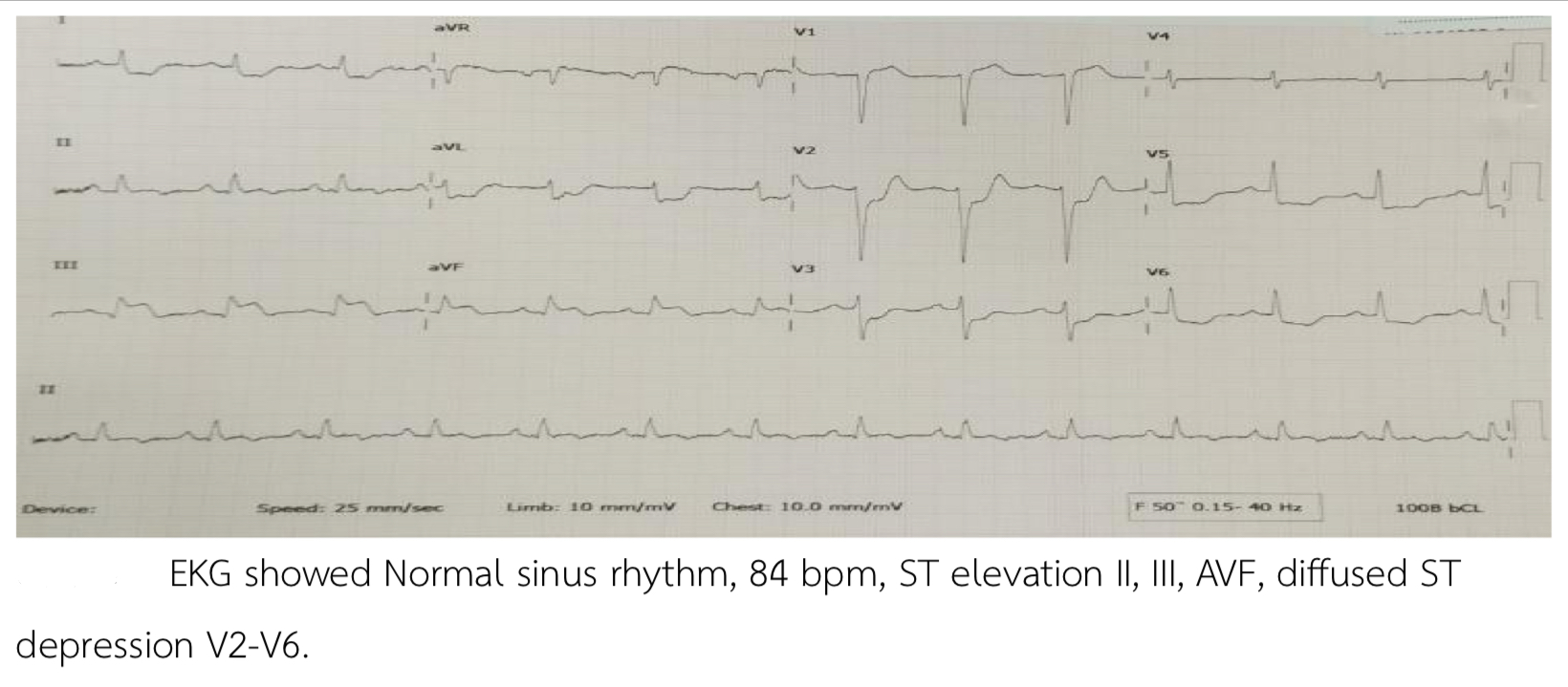 EKG showed NSR, 84 bpm, STE II, III, AVF, diffused STD V2-V6. Echo showed LVEF 42%, Global wall Hypokinesia, no significant VHD. Troponin T was positive 10,400 pg/ml. Chest x-ray showed cardiomegaly, increase pulmonary vasculature.