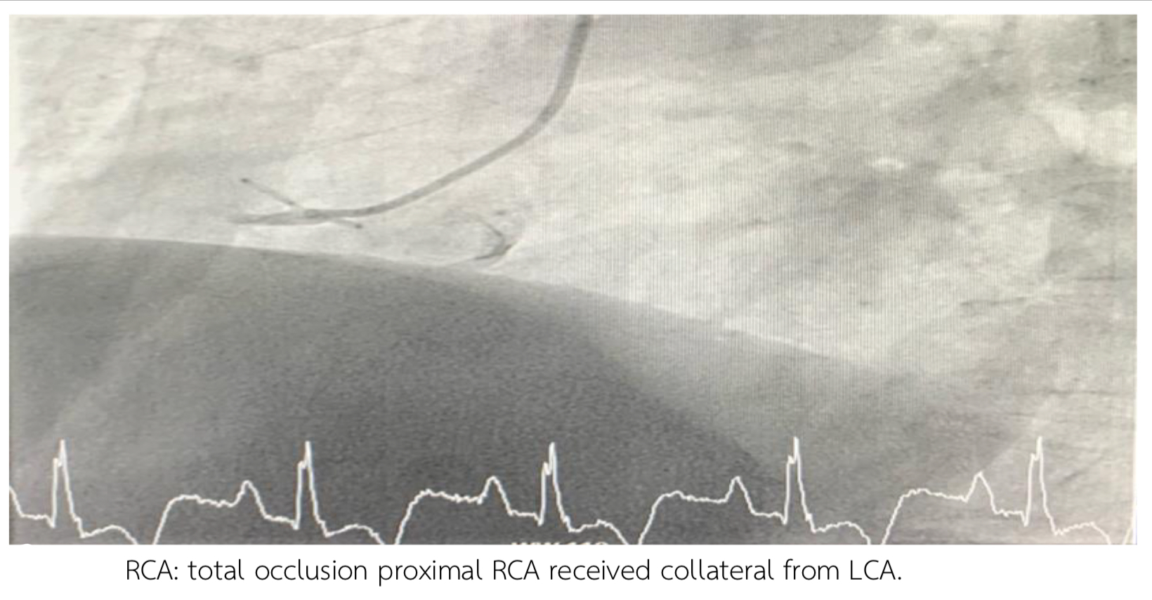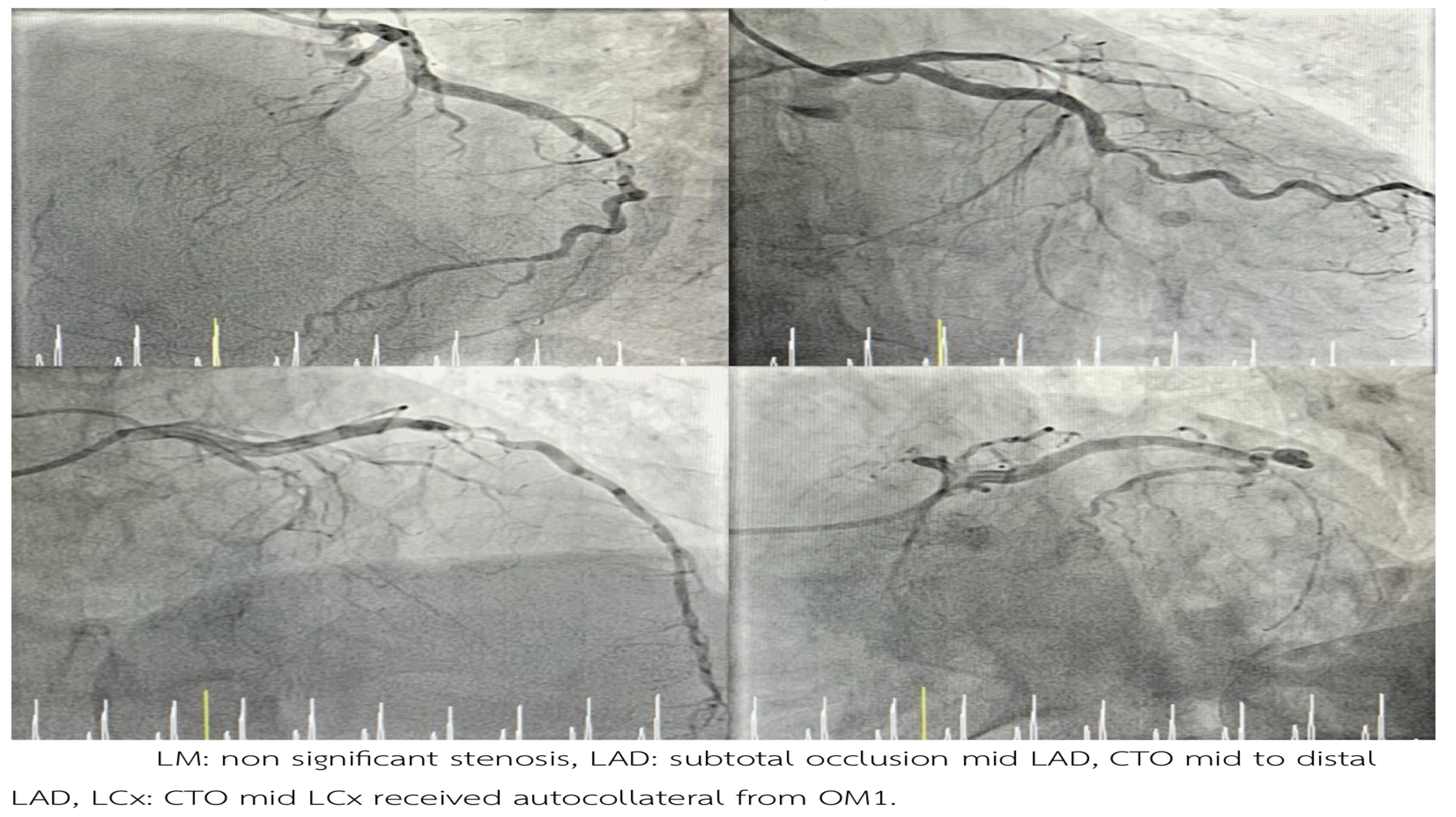 - LM: non significant stenosis - LAD: Subtotal occlusion mid-LAD, CTO m-dLAD. - LCx: CTO mLCx with collateral from OM1. - RCA: Total occlusion pRCA with collateral from LCA.