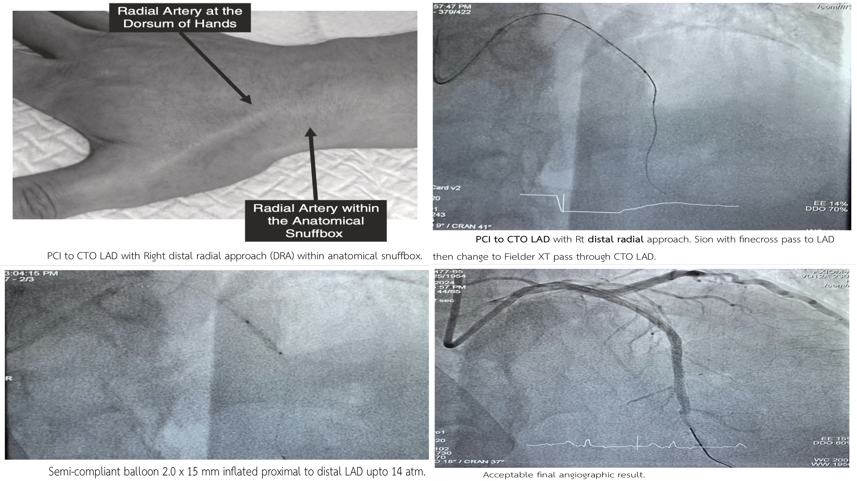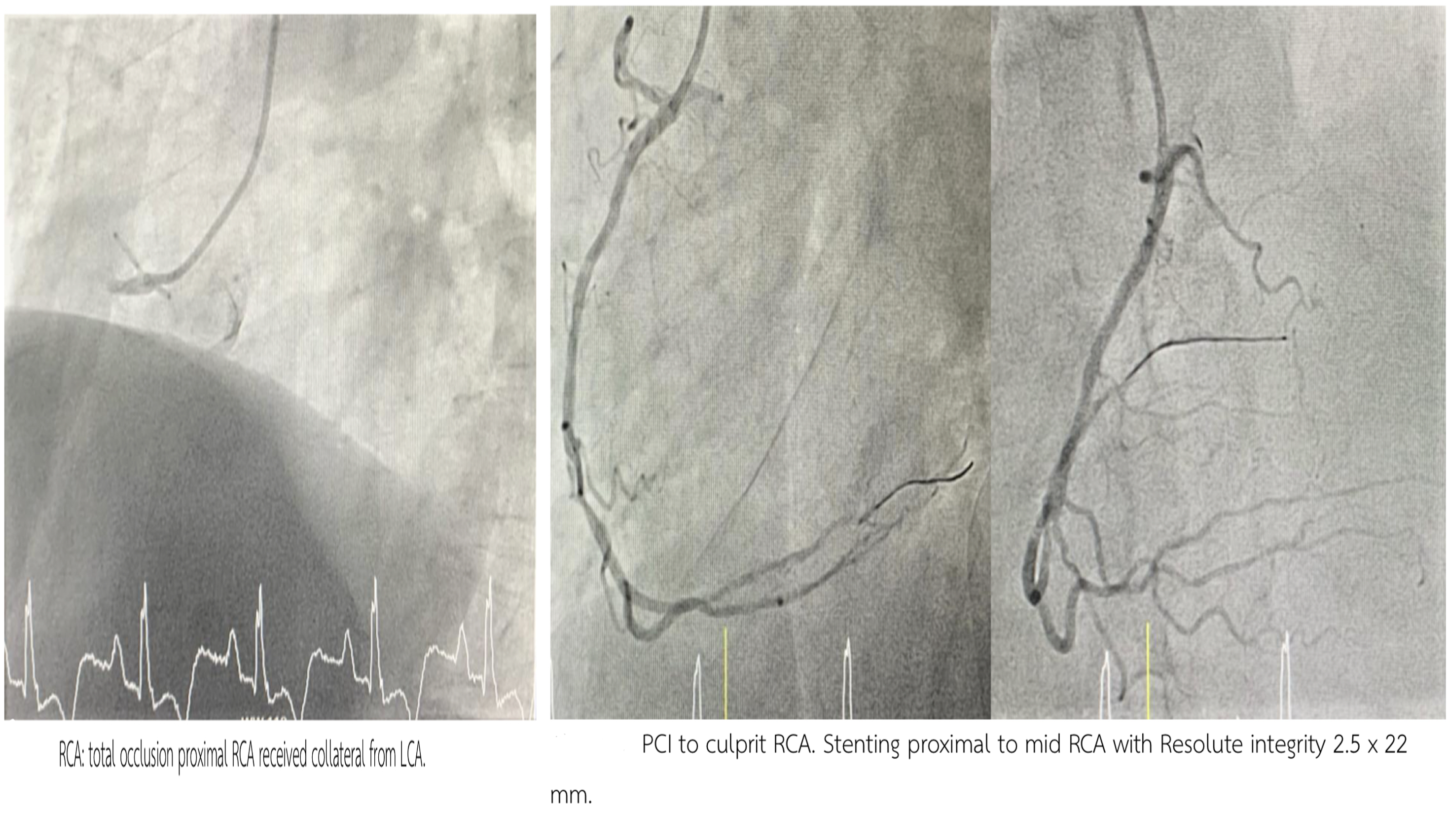 PCI to culprit RCA via Rt radial. GD: 5 Fr Ikari Stenting p-d RCA with Resolute integrity 2.5 x 22 mm upto 12 atm. The patient still had chest pain then stage PCI to CTO LAD with Rt DRA. Staged PCI to CTO LAD via Rt DRA. GD: 5 Fr Ikari Sion with finecross pass to LAD then change to Fielder XT pass through CTO LAD. Tip injection revealed true lumen wiring . SC balloon 2.0 x 15 mm inflated p-dLAD upto 14 atm. Xience ProA 2.5 x 38 mm deployed m-d LAD upto 12 atm. Resolute integrity 2.75 x 30 mm deployed p-m LAD upto 12 atm. Acceptable angiographic result.