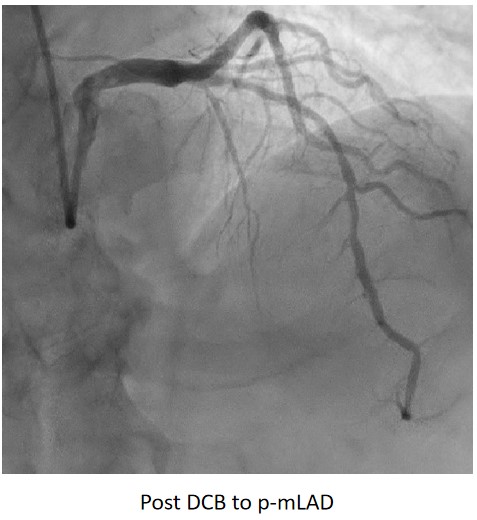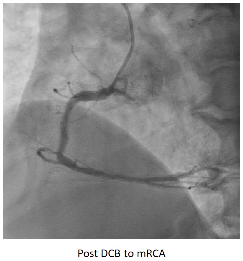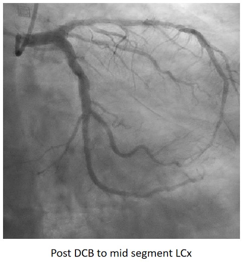Complete revascularisation was achieved with 2-staged procedures. Up-front plaque modification with rotational atherectomy/IVL with IVUS was planned but limited by patient¡¯s cost constraint. Vascular access obtained with transradial puncture with 6 Fr sheath. Guiding catheter (GC) Judkins Right 4.0 (Cordis, USA) 6 Fr was used to engage right coronary ostium. Runthrough Floppy (Terumo, Japan) wire was wired down RCA. Pre-dilatation balloons were unable to cross the heavily calcified mRCA lesion. Next, GC was changed to Amplatz Left 1.0 (Cordis, USA) for better support and proceeded for further lesion preparation with cutting balloon Wolverine (Boston Scientific, USA) 3.5 x 10 mm and DCB Prevail (Medtronic, USA) 3.0 x 20 mm was deployed. We scheduled him for staged PCI to the left coronaries in 2 weeks time via transradial approach with 6 Fr sheath. GC XB LAD 3.5 (Cordis, USA) 6 Fr was used to engage left coronary ostium. Runthrough Floppy was wired down LCx. Mid-distal LCx was prepared with Pantera Pro (Biotronik, Germany) 2.5 x 15 mm and DCB Pantera Lux (Biotronik ,Germany) 3.0 x 15 mm was deployed. Finally, we wired down LAD with Runthrough Floppy. Mid-distal LAD lesion was prepared with Pantera Pro 2.5 x 15 mm and DCB Pantera Lux 3.0 x 30 mm was deployed. Proximal LAD lesion, which was calcified, was further prepared with Wolverine 2.5 x 10 mm before DCB Pantera Lux 3.5 x 30 mm was deployed. Final post-PCI results were acceptable, achieving complete revascularisation for him.