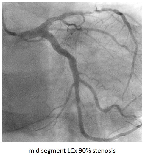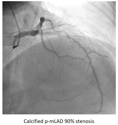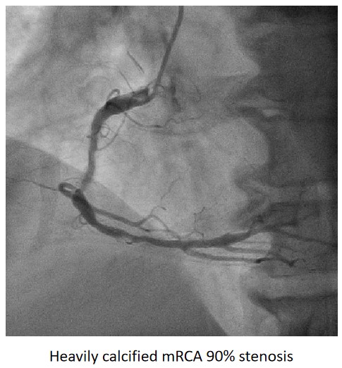 Urgent coronary angiography showed smooth LMCA with severe 3-vessel involvement. There was diffuse LAD lesion with critical stenosis at proximal-to-mid segment. Mid-segment of LCx was 90% stenosed while RCA was heavily calcified with critical stenosis at its mid segment. Our strategy will be complete revascularisation by employing DCB-only strategy.