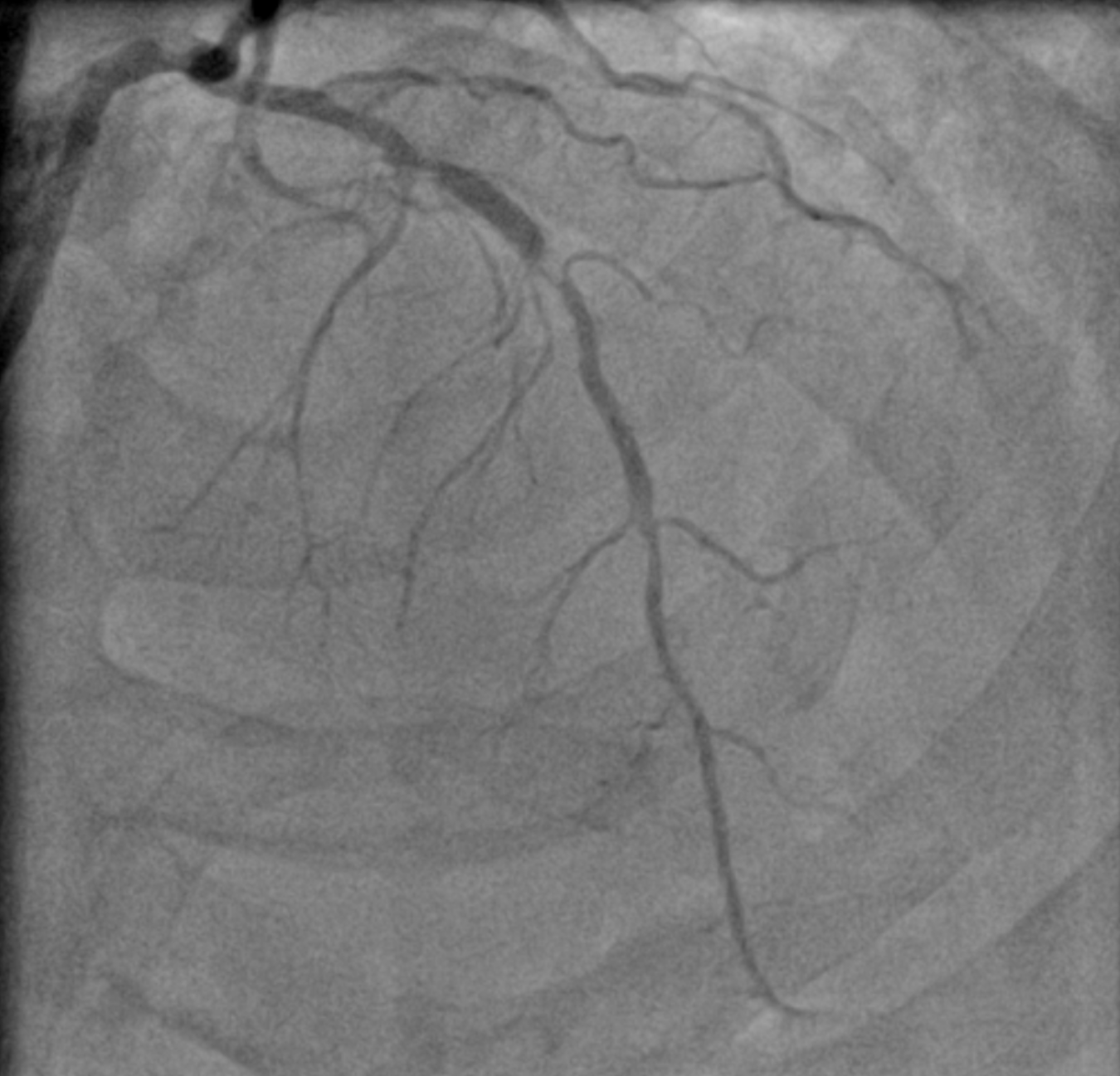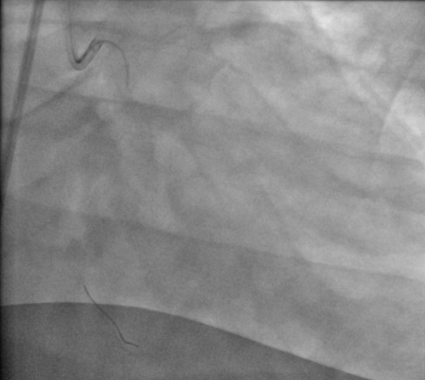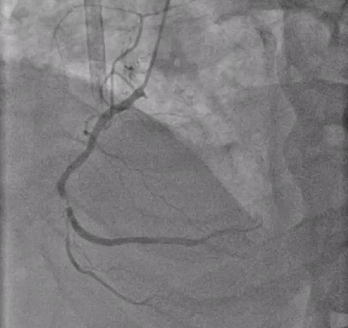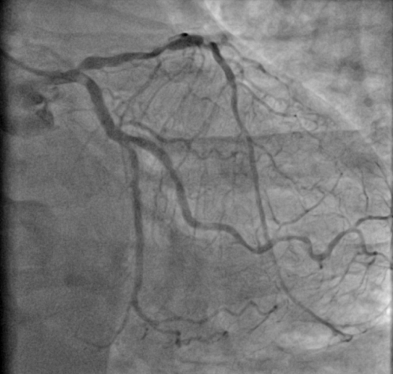 Angiography showed triple vessel disease involving LM-LAD-LCx bifurcation with eccentric calcium nodule in the ostial LCx. Severe calcification was noted throughout the proximal to mid LAD with some focal severe stenosis. RCA showed one area of severe focal stenosis.