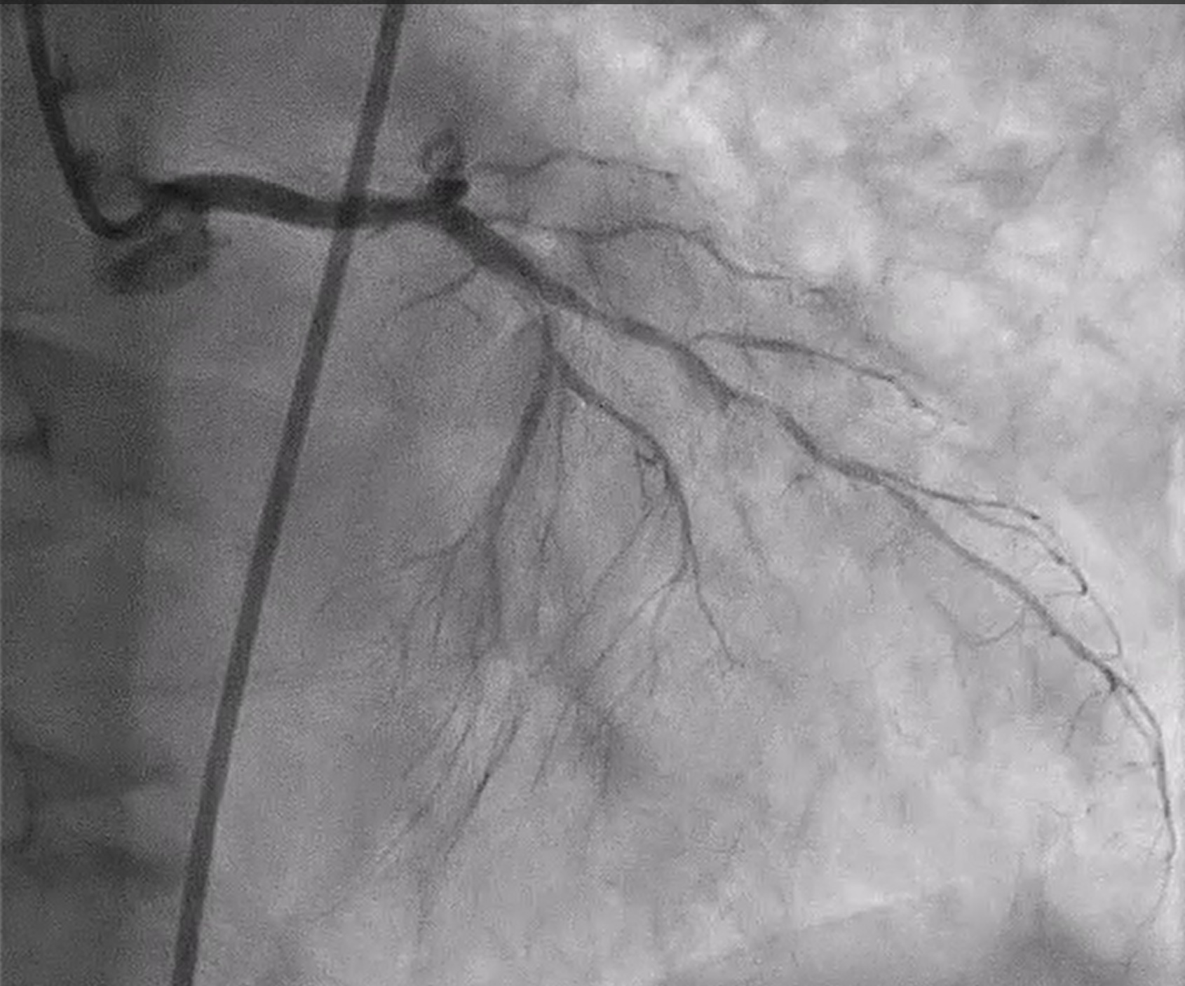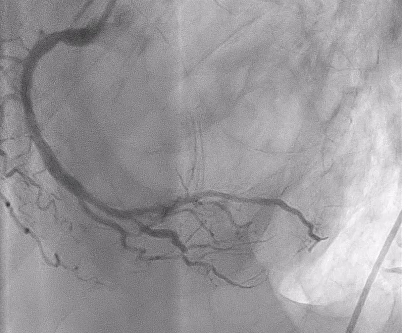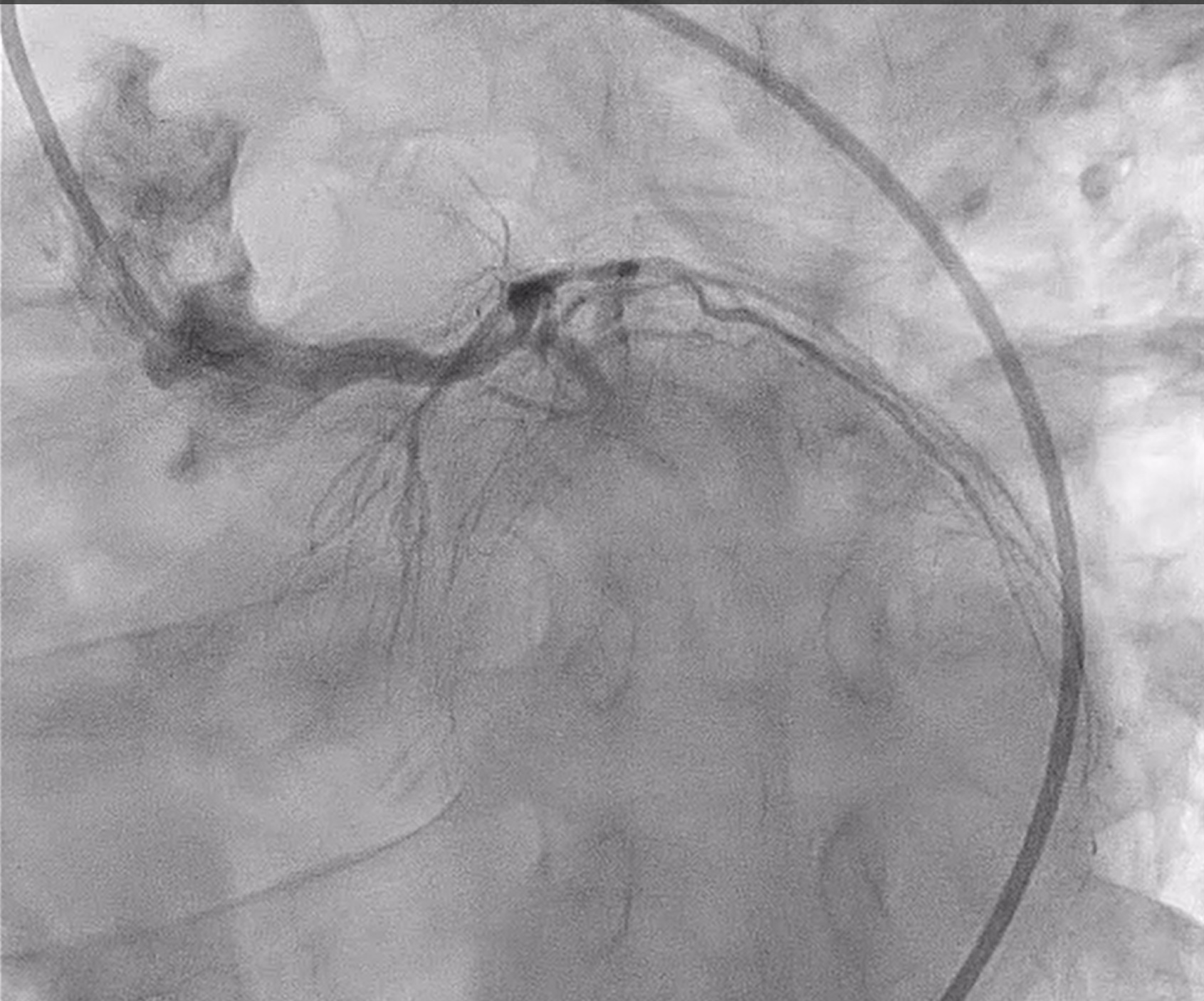 Coronary angiography revealed heavily calcified along LM, proximal to mid LAD, LCx and proximal RCA. 50% stenosis at distal LM bifurcation (Medina 1-1-0). 70% stenosis at proximal LAD and total occlusion at mid LAD. Total occlusion at proximal LCx. No significant stenosis of RCA. There were collateral circulations from septal branch of LAD to distal LAD and from PL to distal LAD and distal LCx.