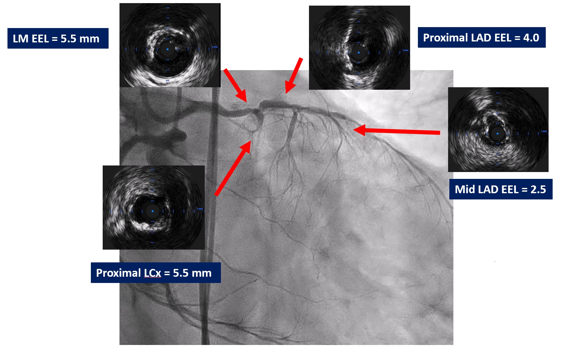 We performed PCI at CTO LAD and LCx with contralateral injection with antegrade wiring and upfront rotablation at LM, LAD and LCx due to heavily calcified lesion. The 7 Fr EBU 3.5 and 6 Fr JR 4.0 catheter were engaged into LCA and RCA, respectively. We opened the LCx CTO segment using microcatheter with Fielder XT guidewire (GW) then rewire from LCx to distal LAD. The CTO GW was exchange to RotaWire Floppy. Rotablation was done at LM-mid LAD with Burr 1.5 mm and LM-proximal LCx with Burr 1.5 mm. IVUS showed EEL of mid LAD = 2.5 mm, proximal LAD = 4.0 mm, distal LM = 5.5 mm and proximal LCx = 3.5 mm. The lesion of mid LAD was prepared with scoring balloon 2.0/15 mm and LM-proximal LAD with scoring balloon 3.5/15 mm. A 2.5/33 mm stent was deployed from proximal-mid LAD. We decided to stenting the lesion at proximal LCx before stenting the lesion at LM-proximal LAD using provisional one stent and POT-kiss-POT technique. A 3.0/26 mm stent was deployed at proximal LCx. A 3.5/38 mm stent was deployed from distal LM-proximal LAD and 3.5/13 mm stent from ostial LM-distal LM. POT was done with a non-compliance (NC) 5.0/12 mm balloon along LM stent. Kissing balloon inflation with NC 3.0/15 mm balloon at LM-LCx and 3.5/15 mm balloon at LM-LAD then final POT with NC 5.0/12 mm was done. IVUS showed well stent expansion, no malapposition and no stent edge dissection. The patient had no re-admission. Echocardiography after 3 months showed significant improvement of LV function to 56%.