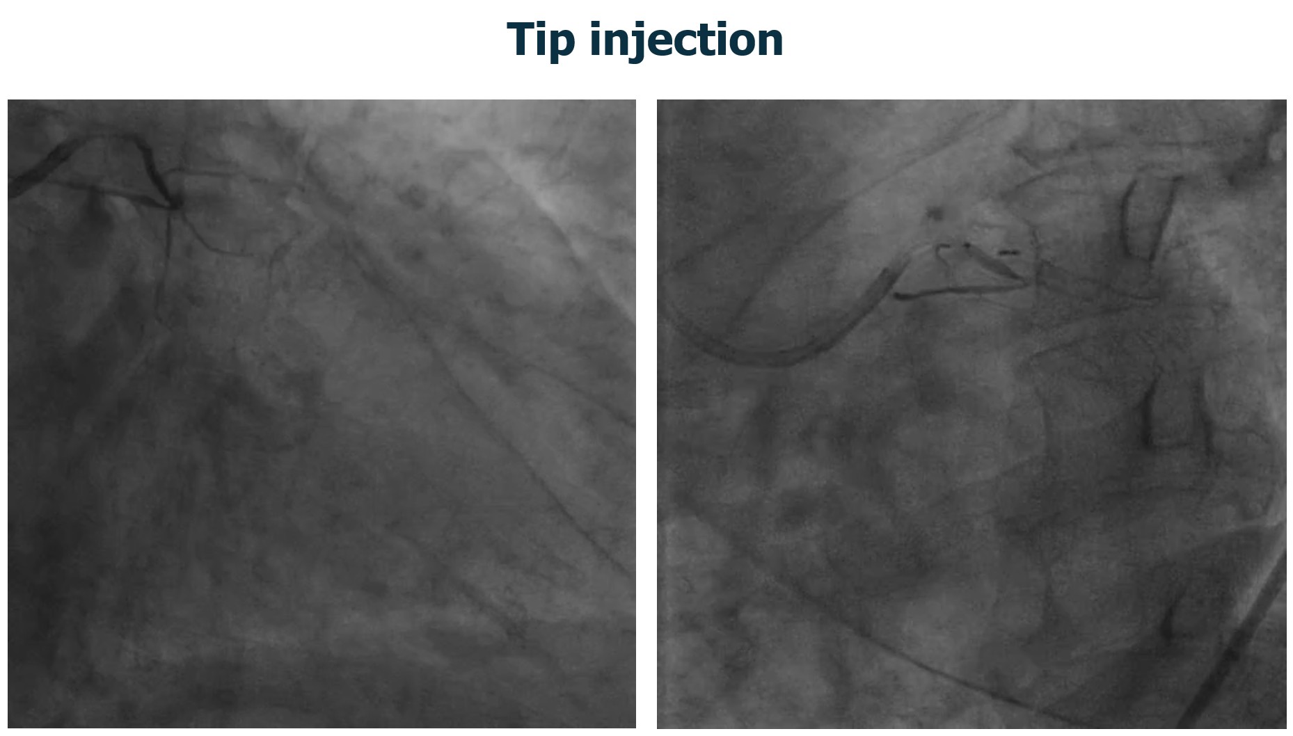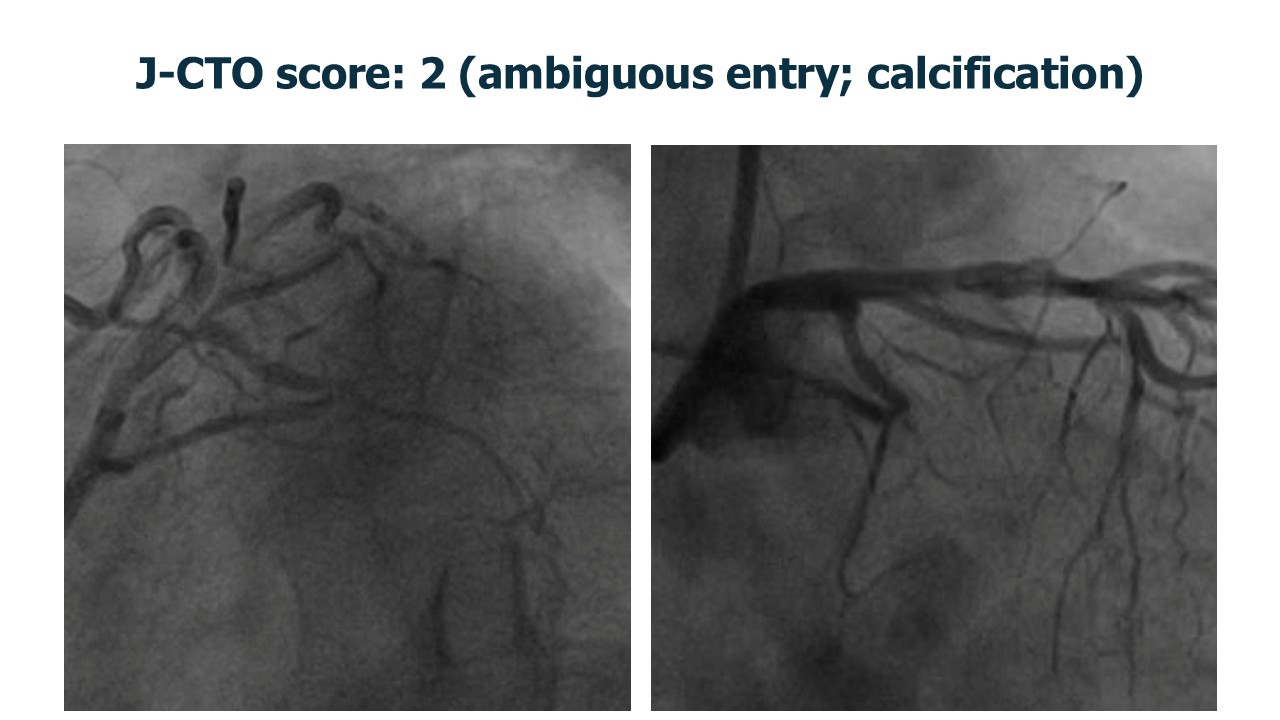Coronary angiography demonstrated patent prior RCA stents. The LCX CTO had a J-CTO score of 3 (ambiguous proximal cap, calcification, and prior failed attempt). Distal LCX was opacified via epicardial collaterals from the PL branch. Antegrade tip injection failed to reveal bridging collaterals or a definable micro-channel for entry, making antegrade crossing unfavorable.