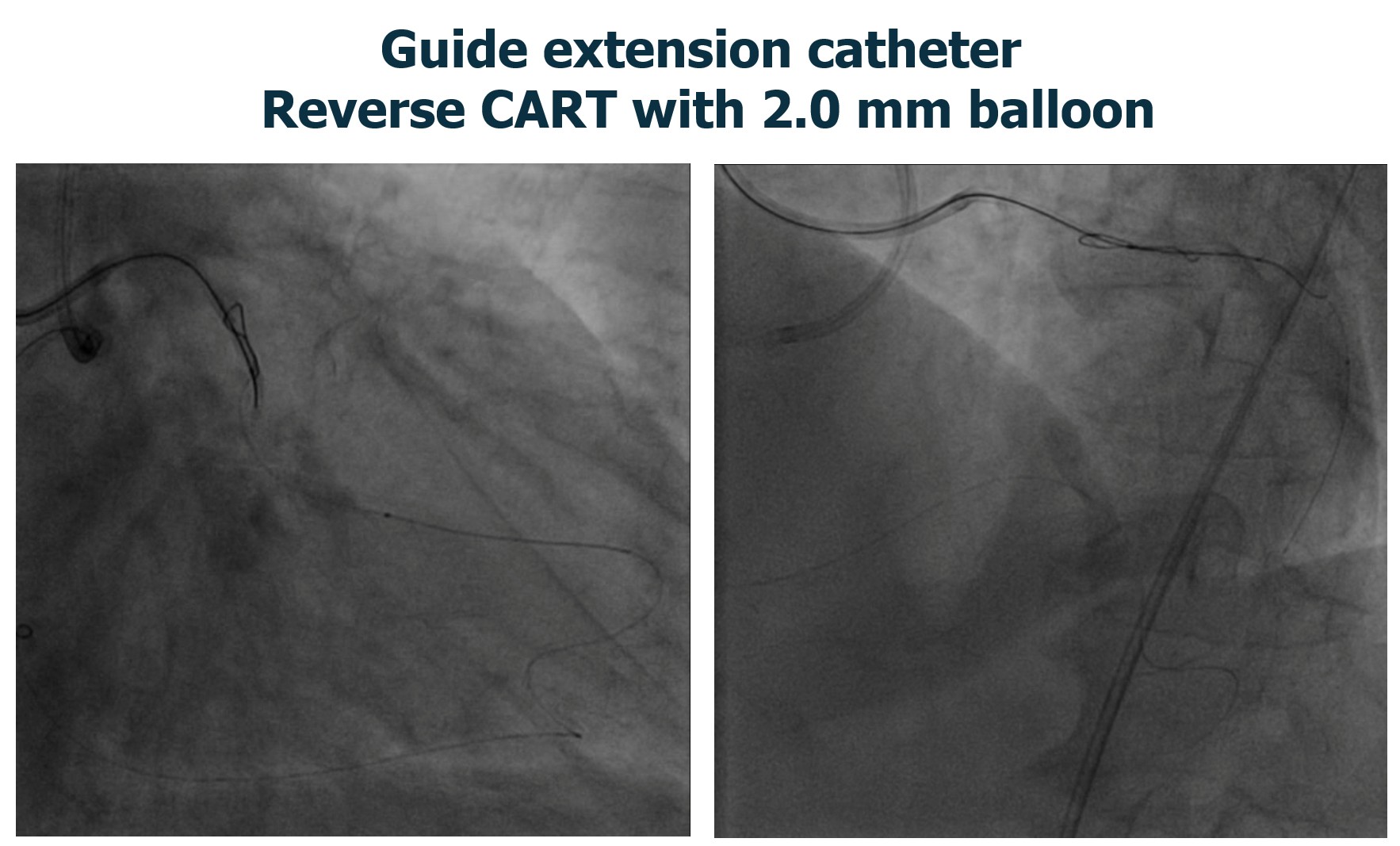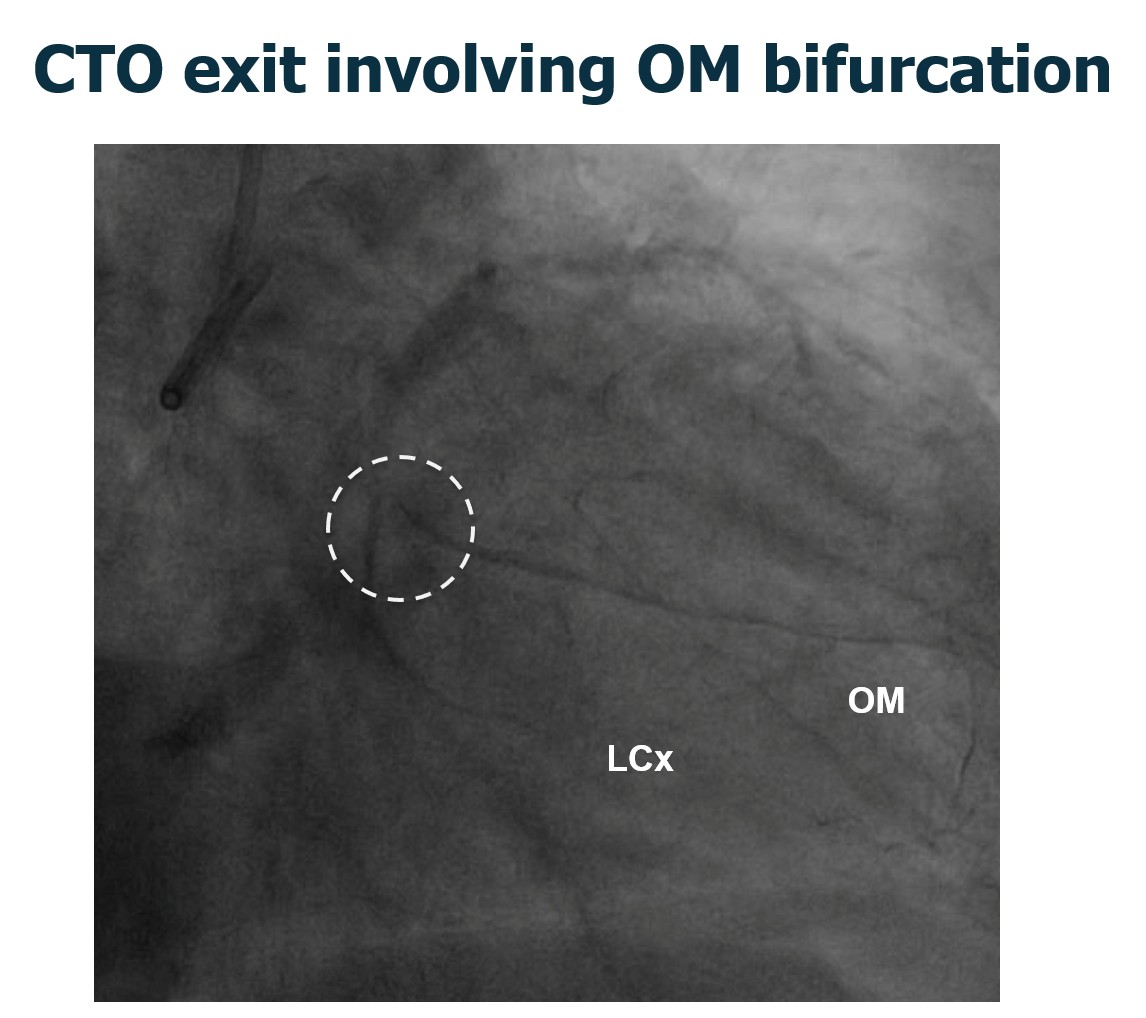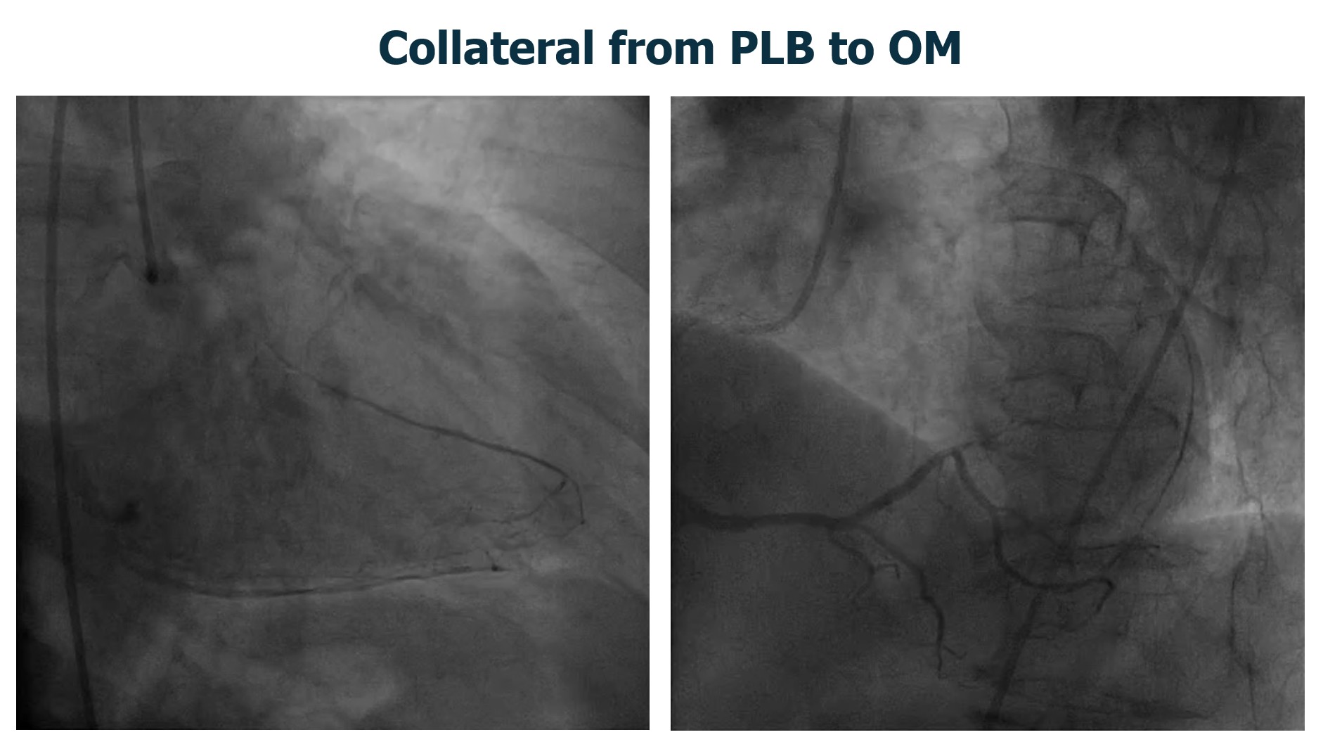 Bilateral coronary engagement with double guiding catheters was used to support both antegrade and retrograde strategies. A retrograde approach through the PL branch was performed, with a microcatheter advanced through epicardial collaterals to the distal OM. Reverse CART was done to create a connection between the antegrade and retrograde spaces.