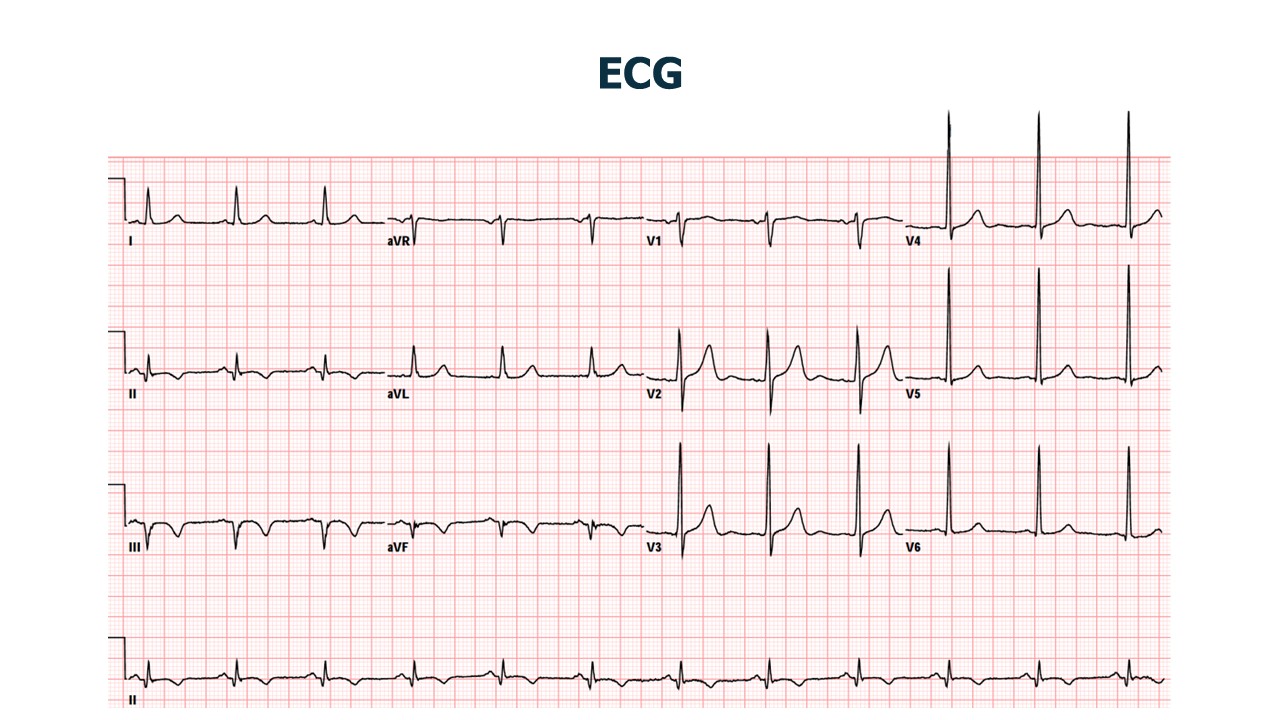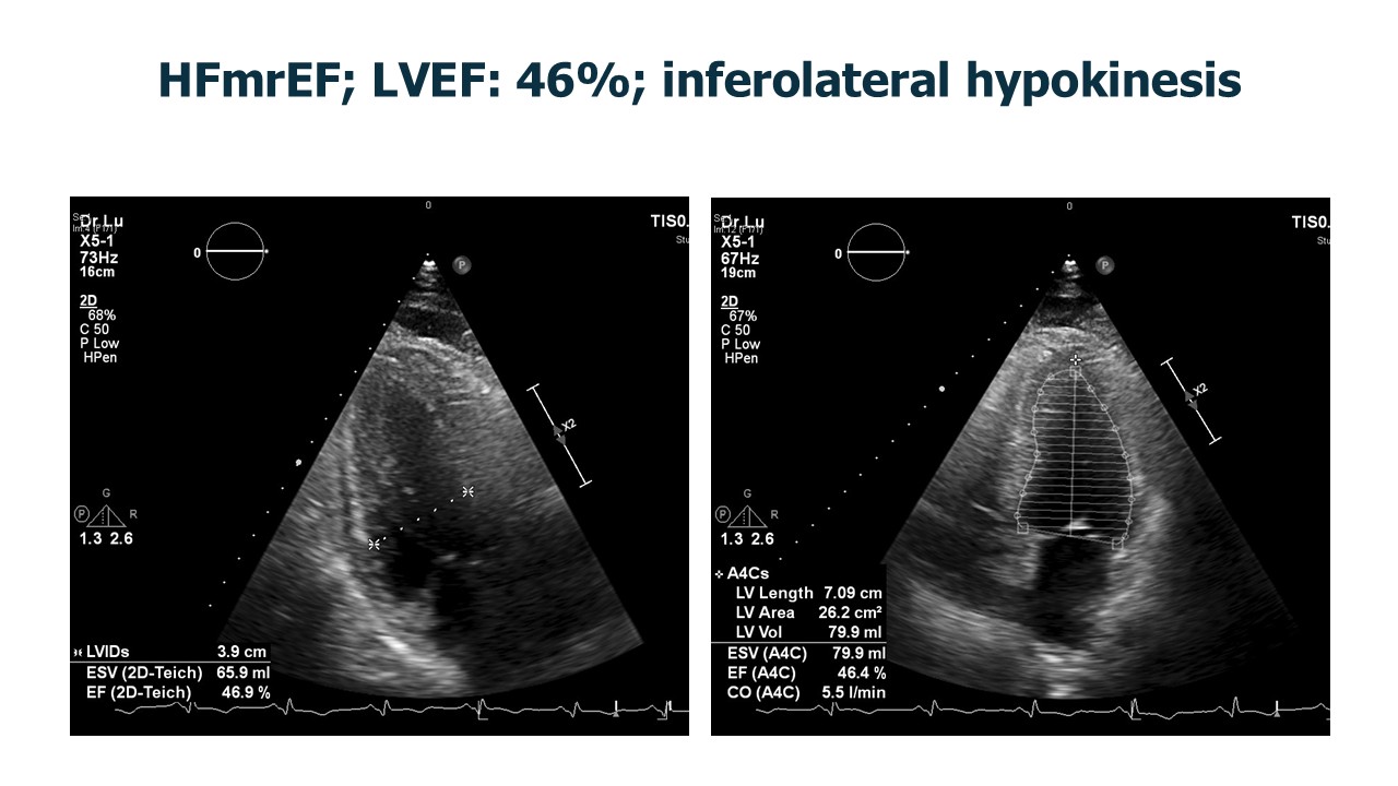 Complete blood count and renal function tests were within normal limits. Glycated hemoglobin was 5.7%. Lipid profile showed total cholesterol 157 mg/dL and low-density lipoprotein 99 mg/dL. B-type natriuretic peptide was elevated at 545 pg/mL. ECG demonstrated T-wave inversion over inferior leads, and echocardiogram revealed mildly reduced ejection fraction of 46% with inferolateral wall hypokinesis.