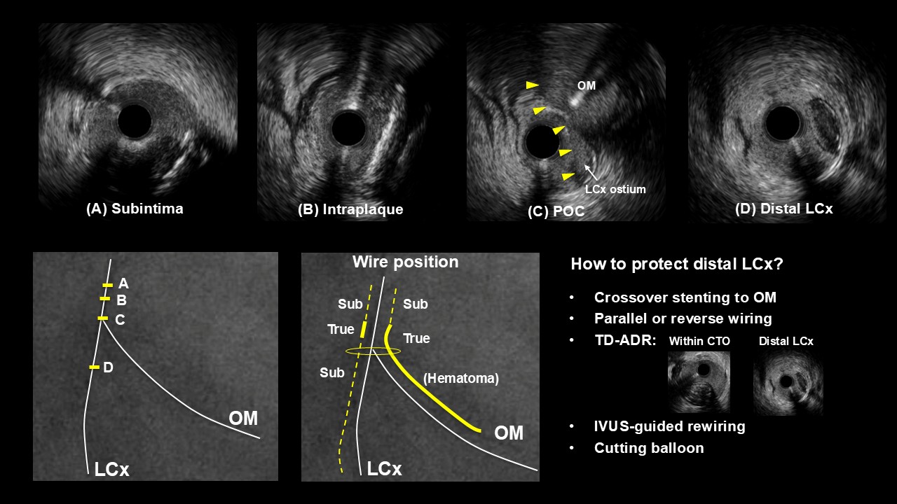 This case illustrates the value of a bidirectional strategy for complex distal bifurcation CTOs, where preservation of important side branches such as the OM is critical. The combination of retrograde techniques, guide extension catheter–assisted tip-in, and a double guiding catheter setup enabled controlled crossing and support. IVUS was essential at multiple stages to confirm wire position, detect subintimal passage and hematoma, and guide rewiring into the true lumen across the bifurcation.
