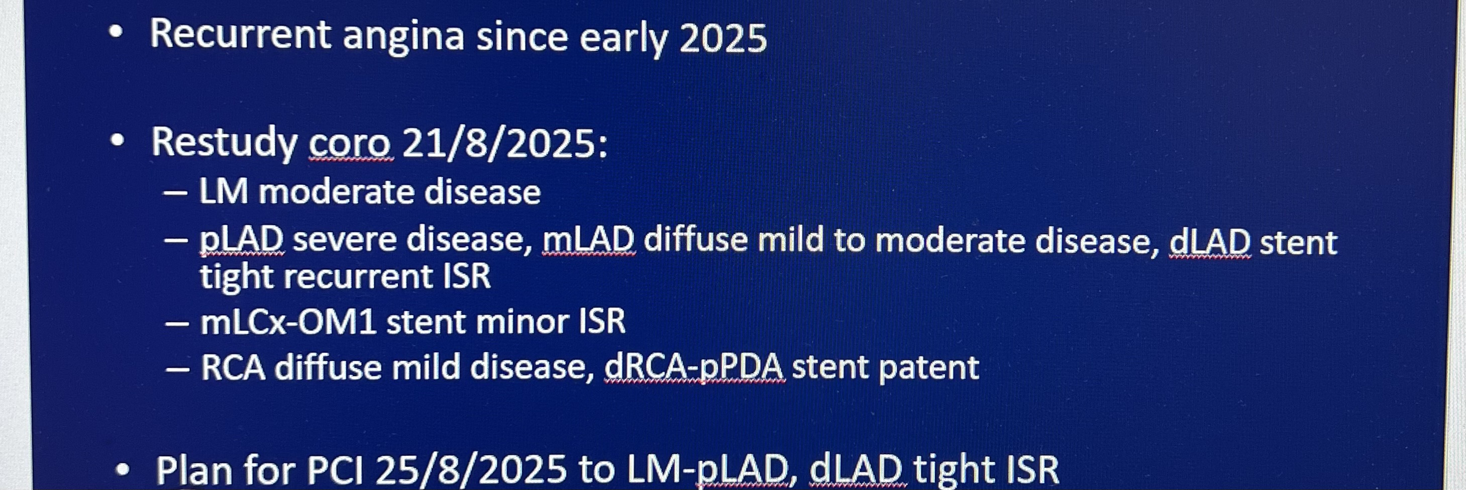 Restudy coro 21/8/2025: LM moderate disease pLAD severe disease, mLAD diffuse mild to moderate disease, dLAD stent tight recurrent ISRmLCx-OM1 stent minor ISRRCA diffuse mild disease, dRCA-pPDA stent patent