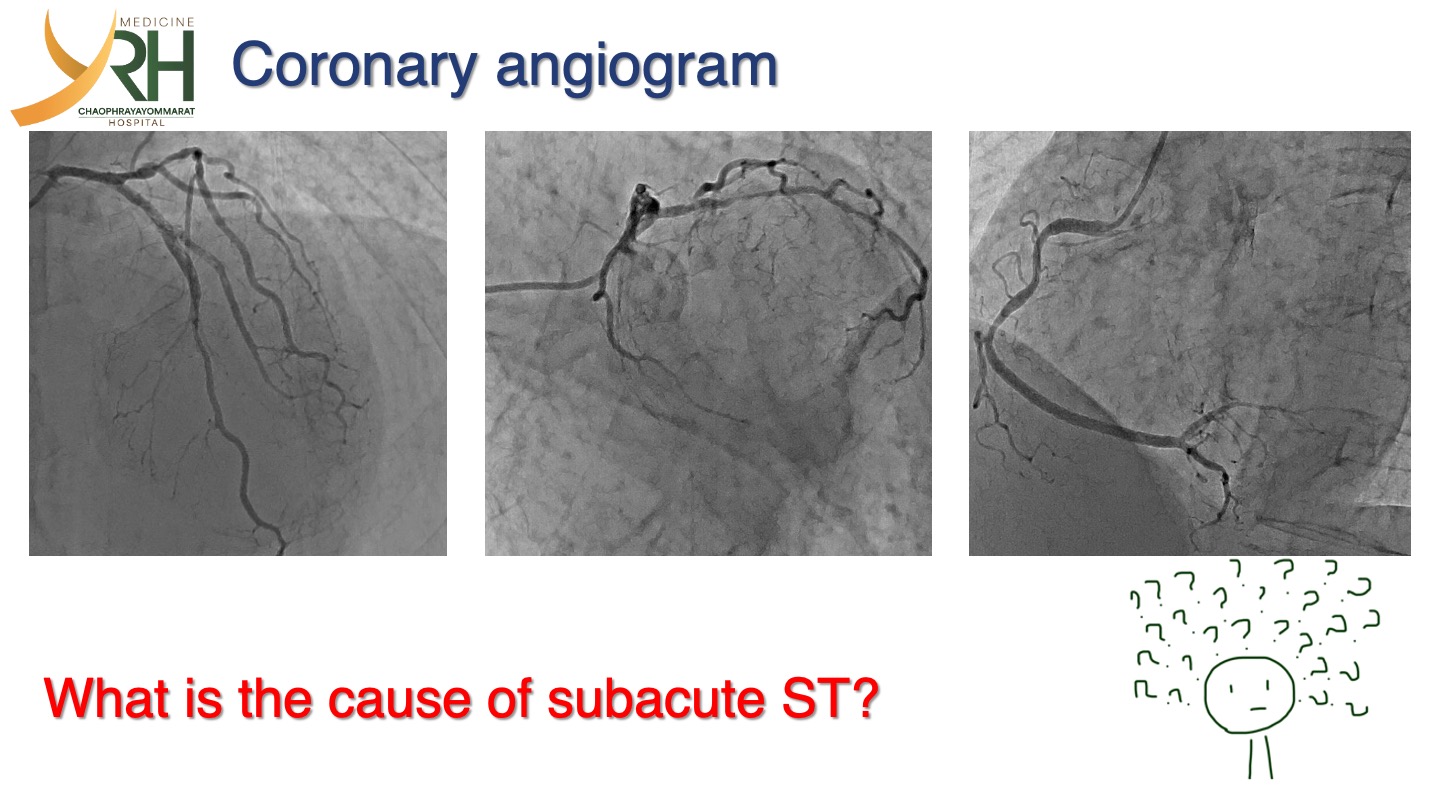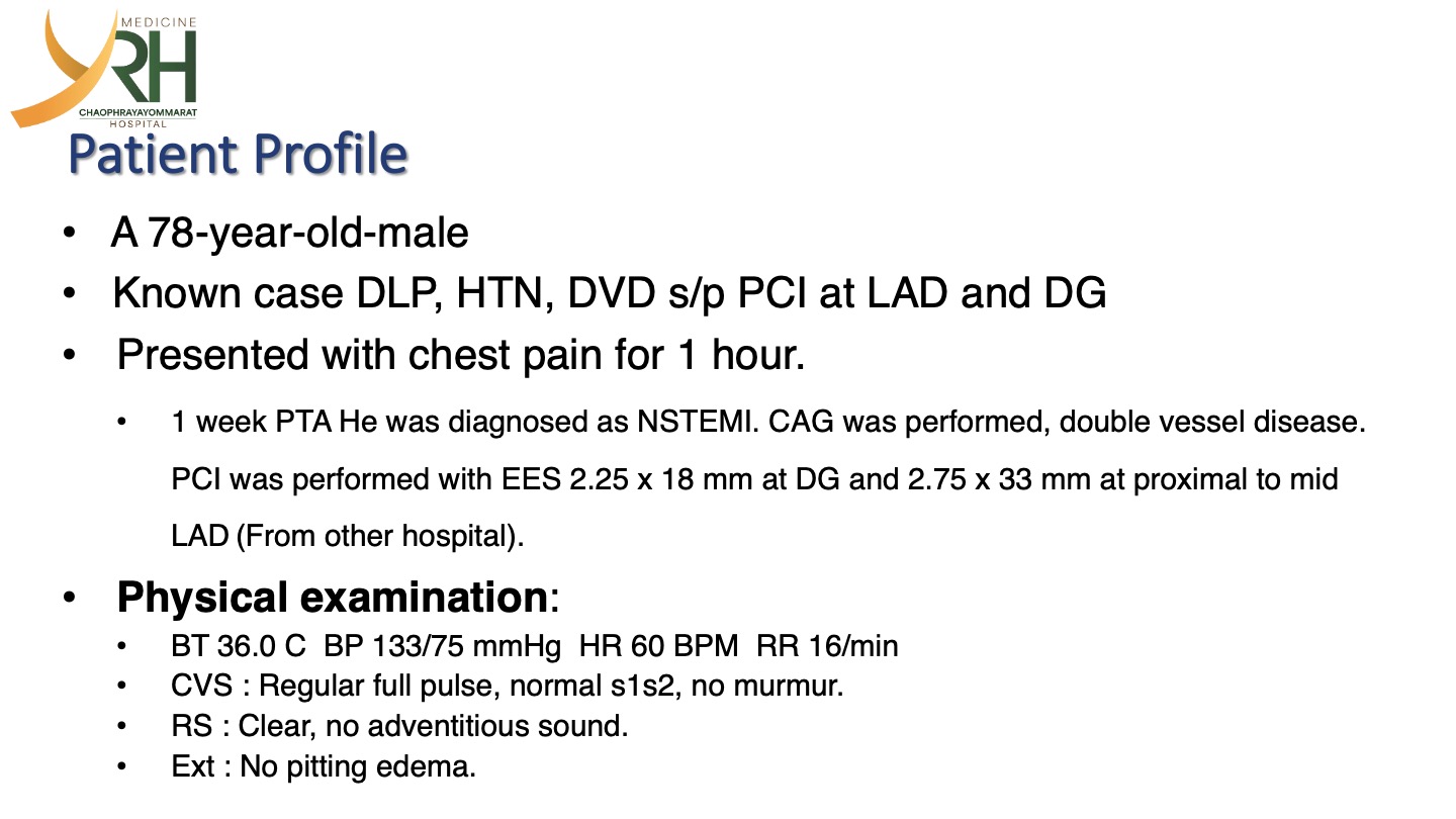 A 78-year-old-male Known case DLP, HTN, DVD s/p PCI at LAD and DGPresented with chest pain for 1 hour. • 1 week PTA He was diagnosed as NSTEMI. CAG was performed, double vessel disease. PCI was performed with EES 2.25 x 18 mm at DG and 2.75 x 33 mm at proximal to mid LAD (From other hospital).Physical examination:• BT 36.0 C BP 133/75 mmHg HR 60 BPM RR 16/min• CVS : Regular full pulse, normal s1s2, no murmur.• RS : Clear, no adventitious sound.• Ext : No pitting edema.