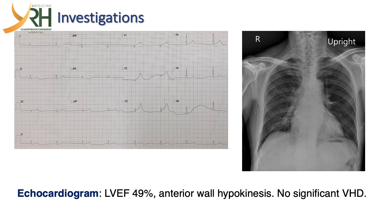 ECG sinus bradycardia with STE at V1-3.Echocardiogram: LVEF 49%, anterior wall hypokinesis. No significant VHD.CXR: Borderline cardiomegaly. No widening mediastinum.