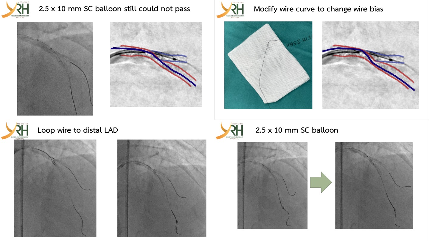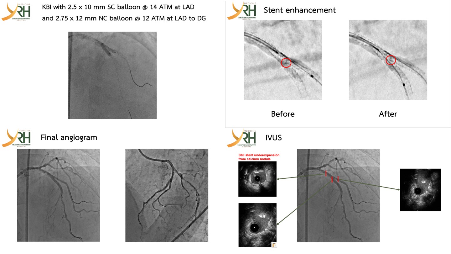 - After POBA at LAD/DG stent, 3.0 x 15 mm NC balloon, 1.5 x 15 mm SC balloon and IVUS could not cross to mid LAD.