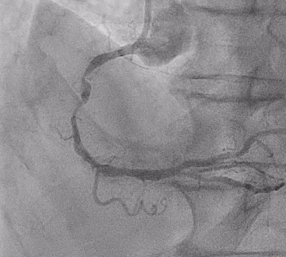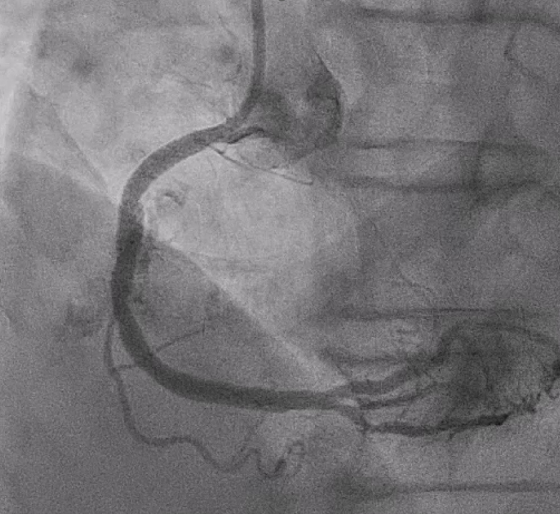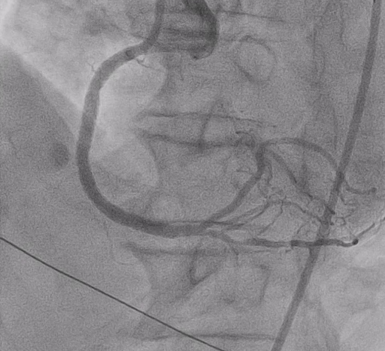 A 77-year-old man with hypertension, dyslipidemia, and previous subacute cerebral infarction presented with exertional dyspnea for two months. He had known triple-vessel coronary artery disease with prior PCI to the LCX. Physical examination revealed clear lungs, regular heartbeat without murmurs, and no peripheral edema. He was admitted for elective CAG and possible PCI for residual LAD and RCA stenoses.